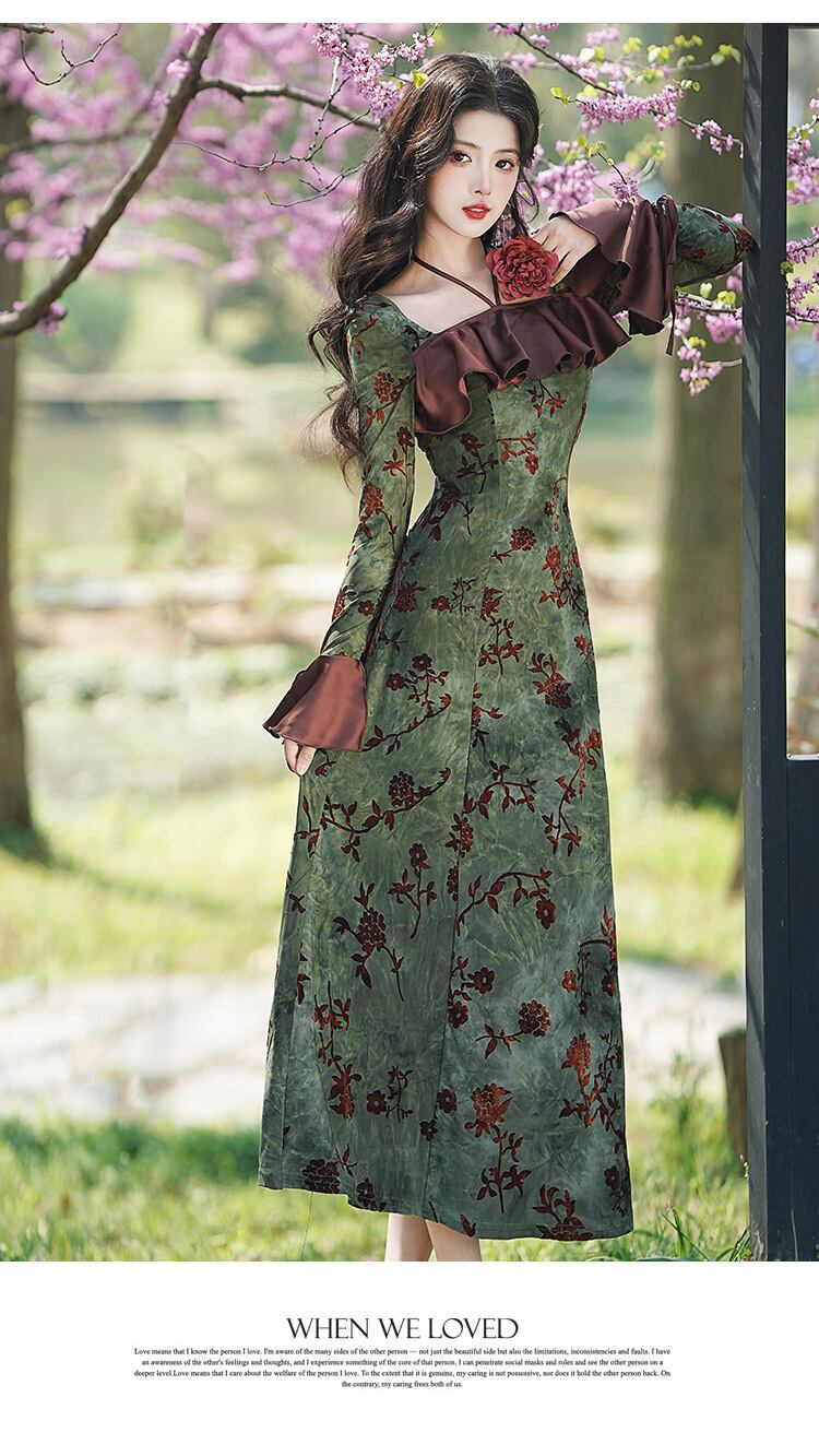 可愛い ワンピース 長袖 ハイウェスト Aライン スクエアネック ロングワンピース