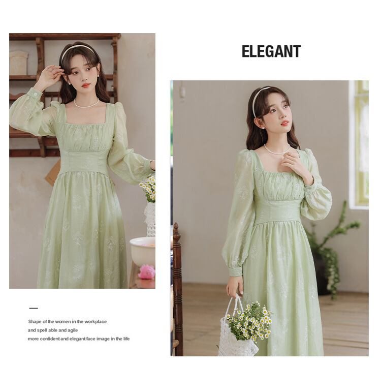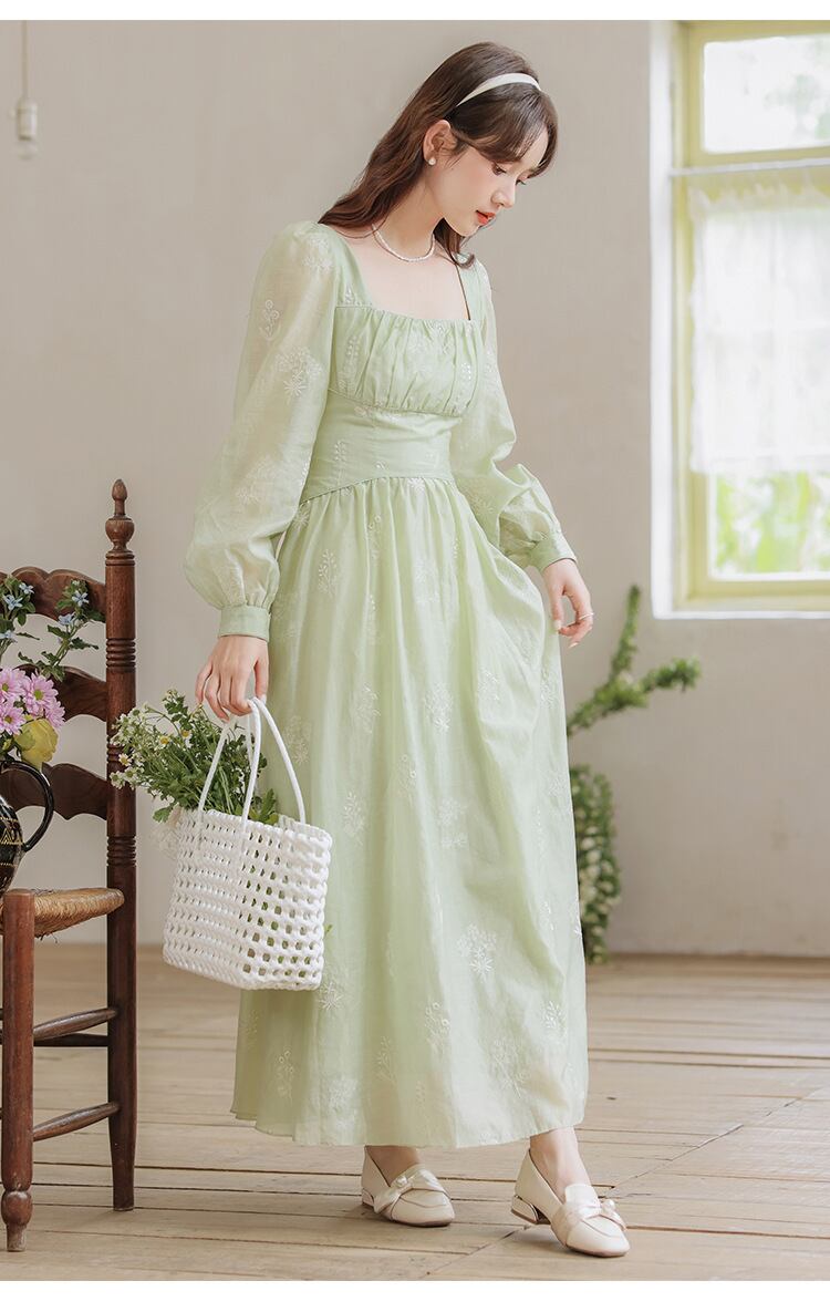 刺繍 ワンピース 長袖 ハイウェスト Aライン スクエアネック おしゃれ