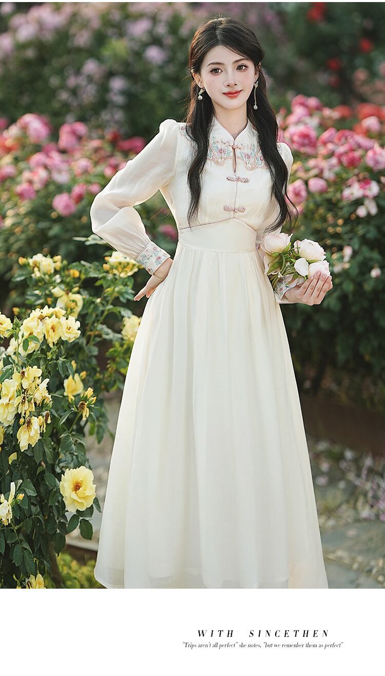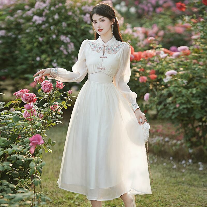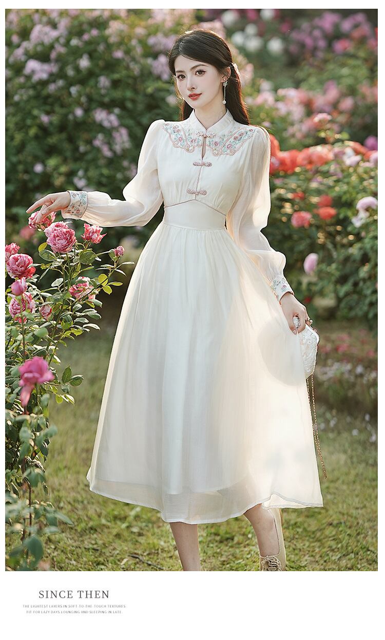 刺繍 チャイナ風ワンピース ハイウェスト Aライン ロングワンピース