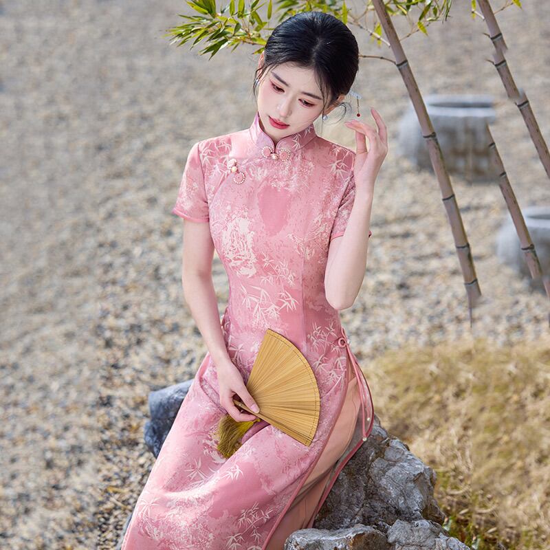 ピンク アオザイ スタンドネック 改良チャイナドレス ワンピース 洋服 着心地抜群