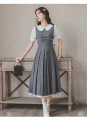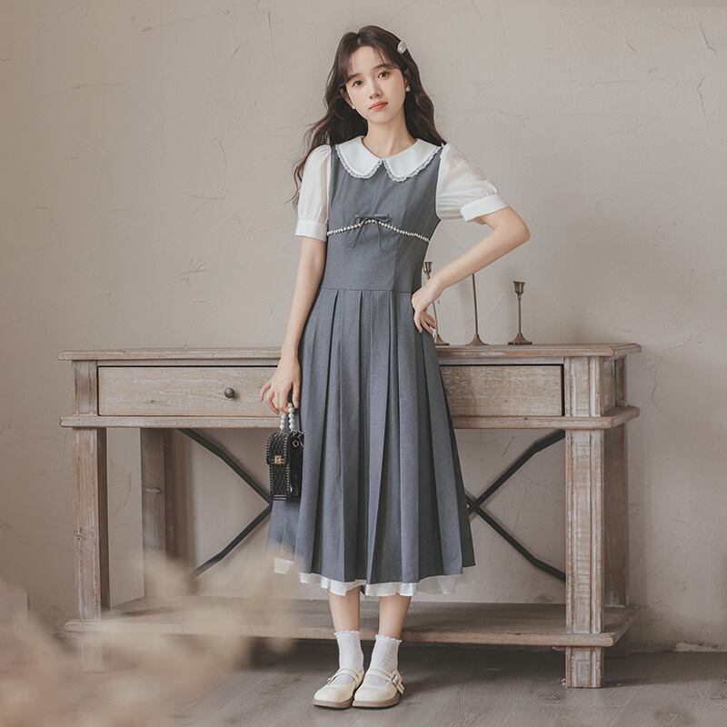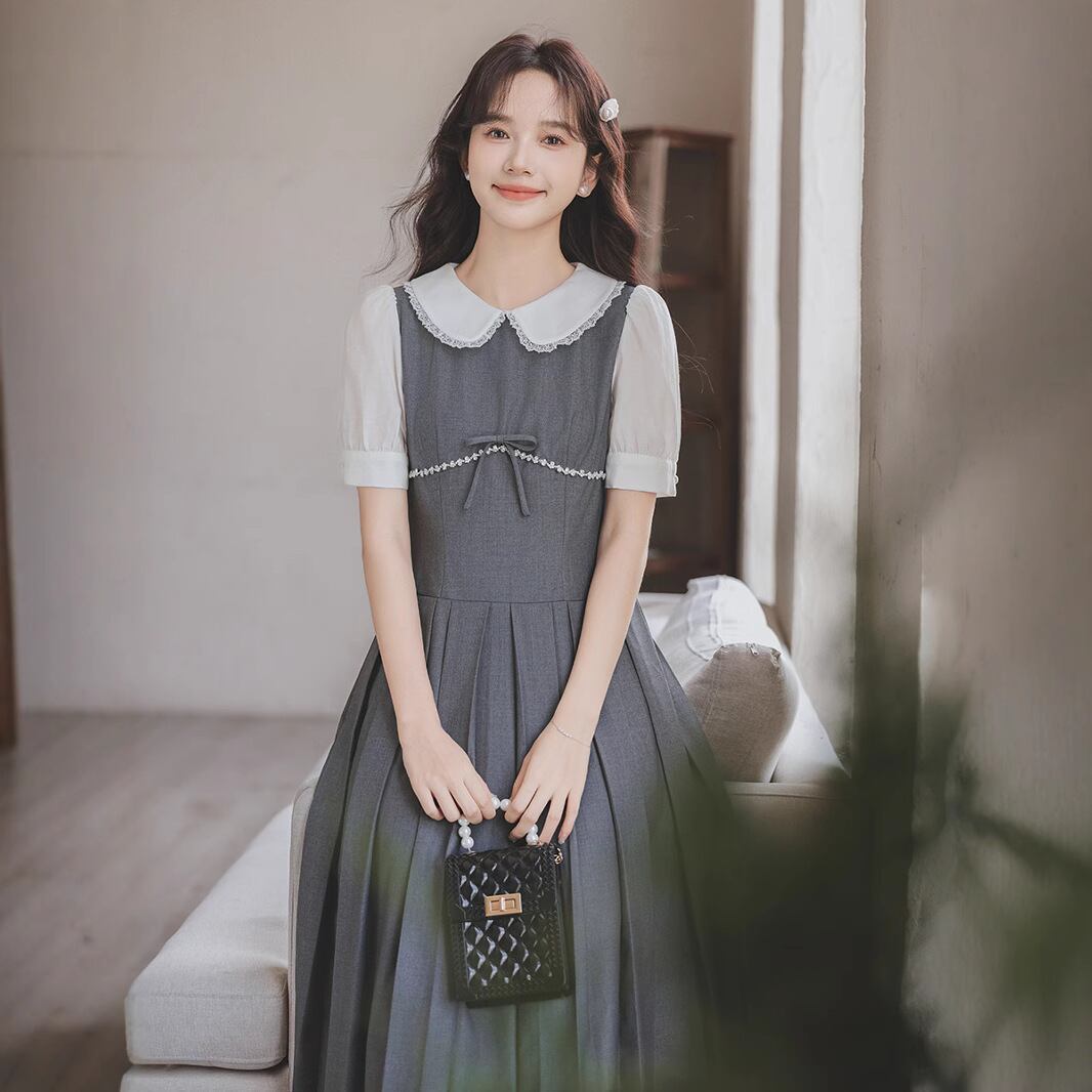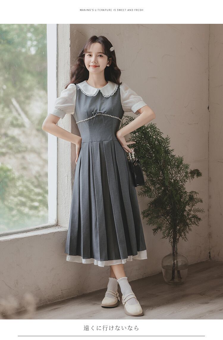 ワンピース 半袖 丸襟 ハイウェスト Aライン 可愛い ロングワンピース