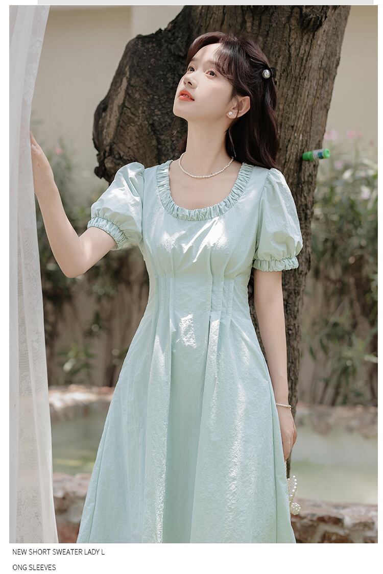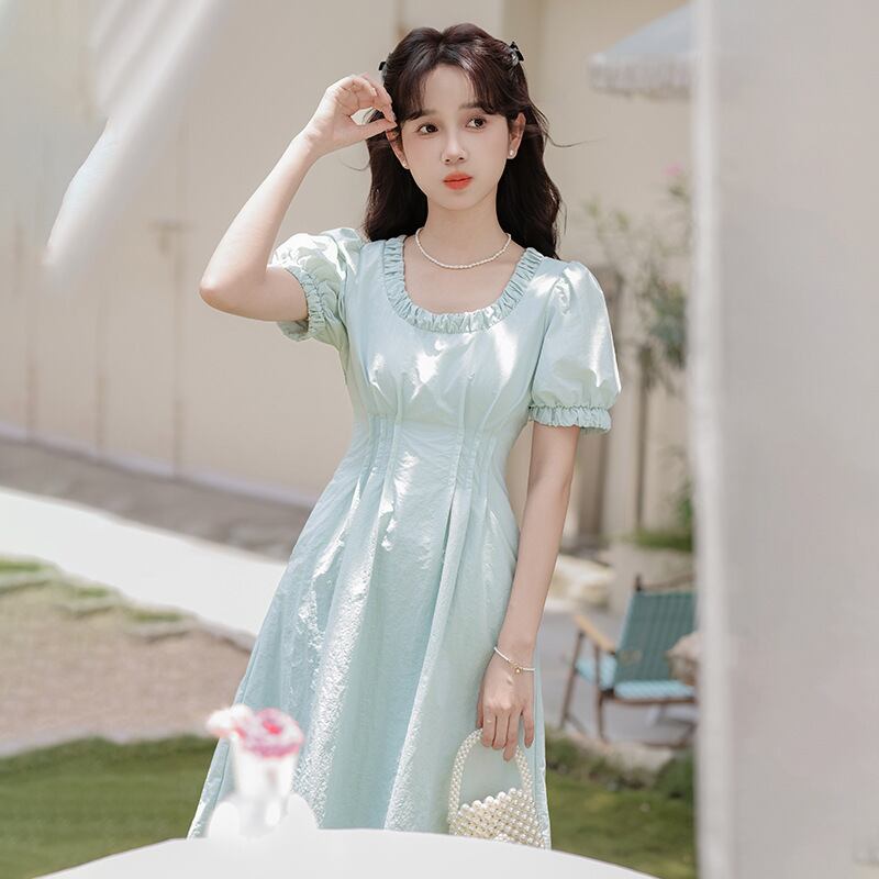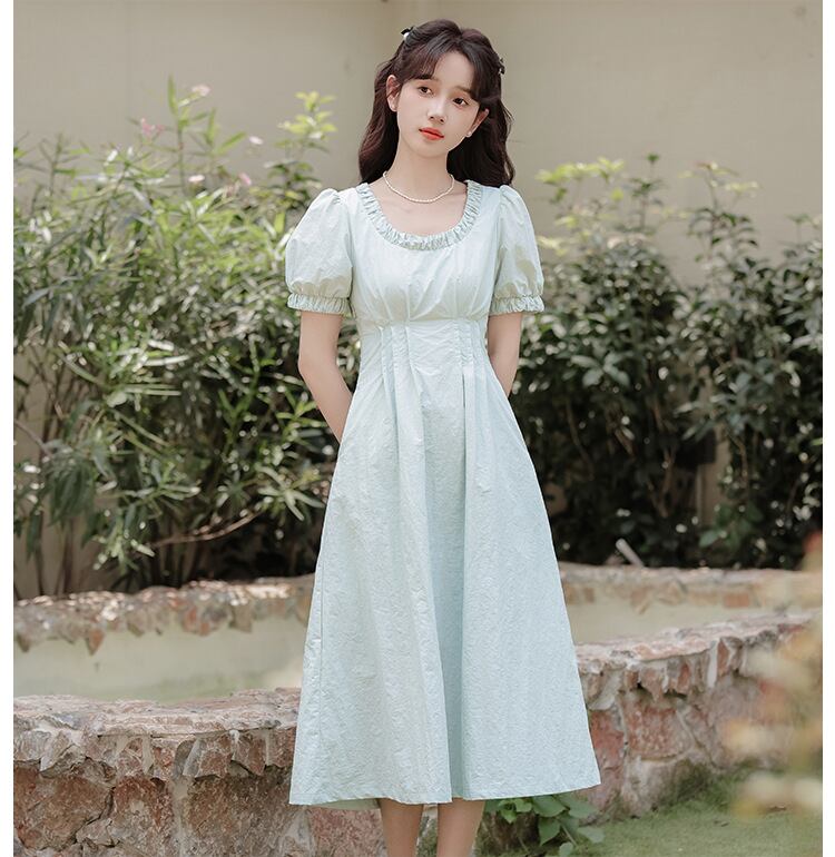 ワンピース 半袖 丸襟 ハイウェスト Aライン 可愛い ロングワンピース