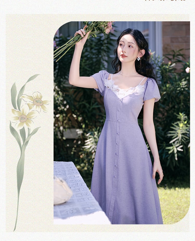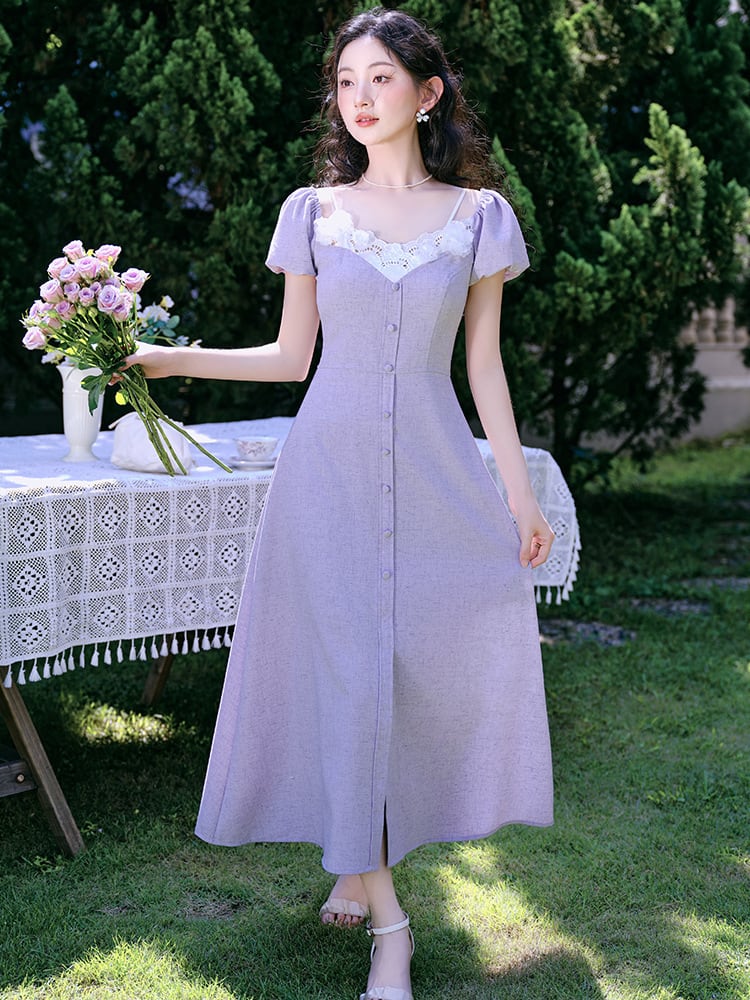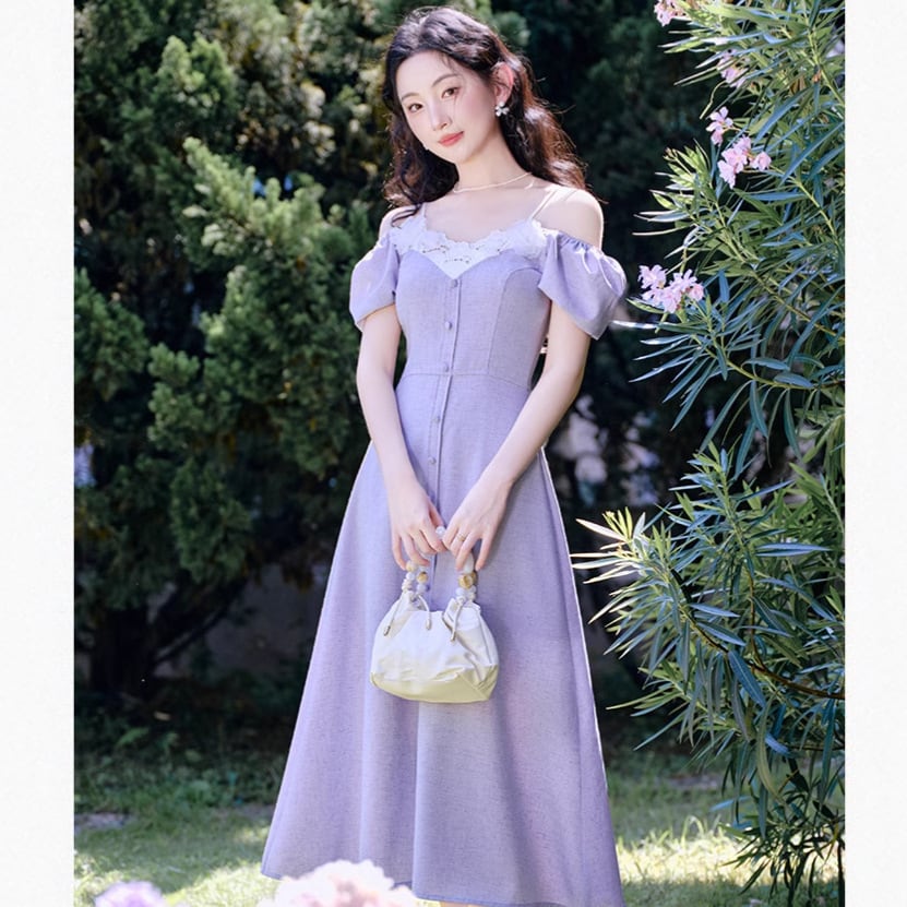 パープル ワンピース レース切り替え ハイウェスト Aライン オシャレ ロングワンピース