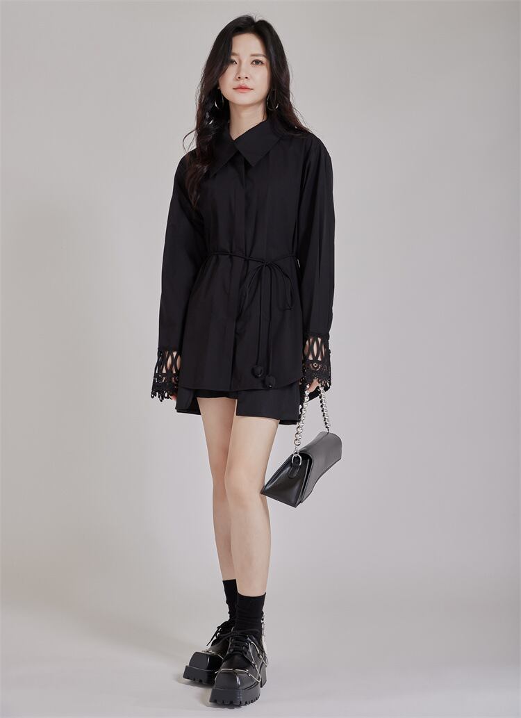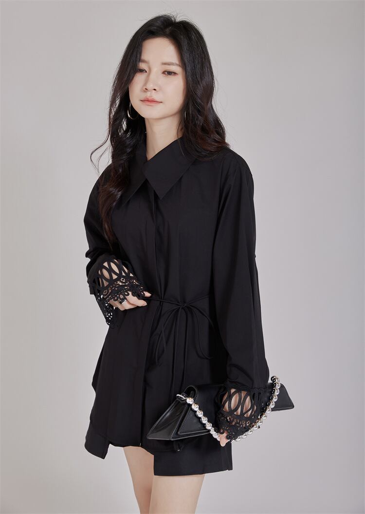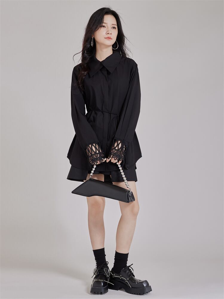 ブラック ブラウス 透かし彫り 長袖 スピーカースリーブ poloネック オリジナル 個性的 ルーズ 着痩せ