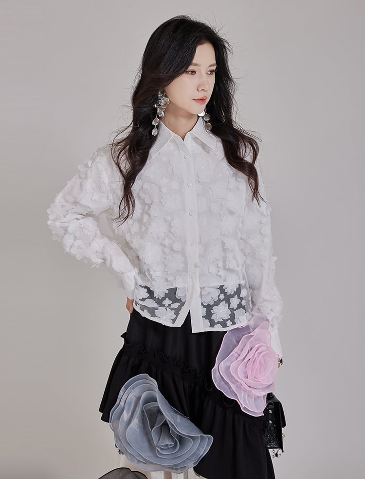 エレガント ブラウス 花 長袖 折り襟 きれいめ オリジナルデザイン