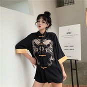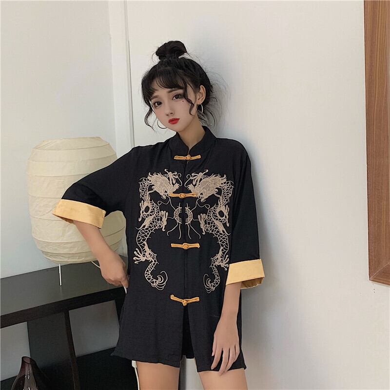 売れ筋 チャイナ風 Tシャツ スタンドネック 七分袖 刺繍 龍柄 チャイナボタン 改良唐装 チャイナ風服 ブラック