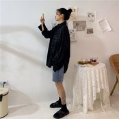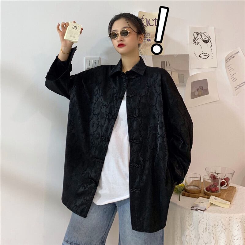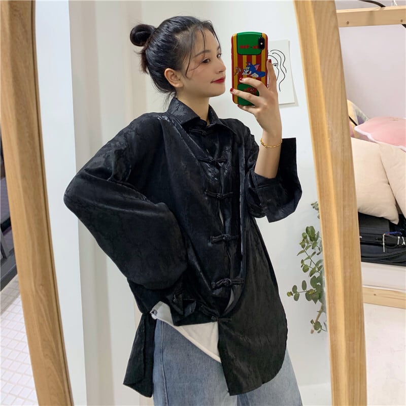 チャイナ風 ブラウス 折り襟 長袖 チャイナボタン 改良唐装 チャイナ風服 ブラック