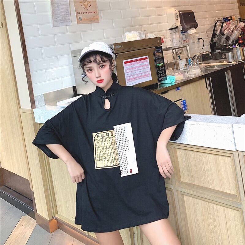 チャイナ風 2色 Tシャツ スタンドネック 半袖 チャイナボタン 改良唐装 チャイナ風服 大きいサイズ ブラック ホワイト