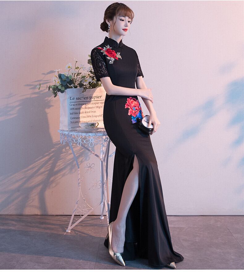 レース ロングチャイナドレス スタンドネック 半袖 パーティードレス チャイナ風服 着痩せ 上品 レトロ 女子会 同窓会 大きいサイズ