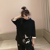 チャイナ風セットアップ Tシャツ+ズボン 2点セット スタンドネック 鶴 刺繍 長袖 チャイナボタン 改良唐装 チャイナ風服 大きいサイズ ブラック