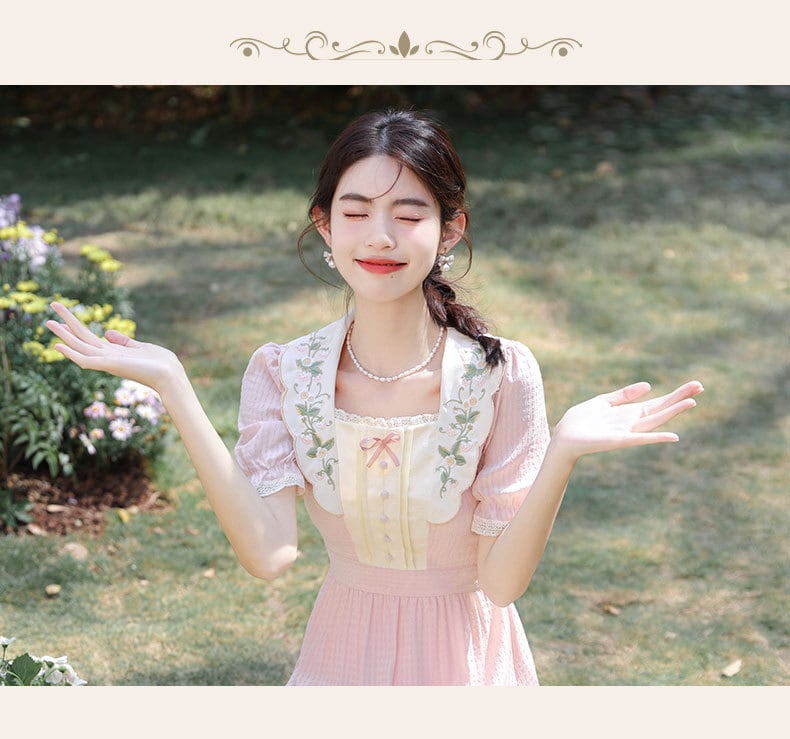 可愛い 刺繡 ワンピース ハイウェスト 半袖 ロングワンピース