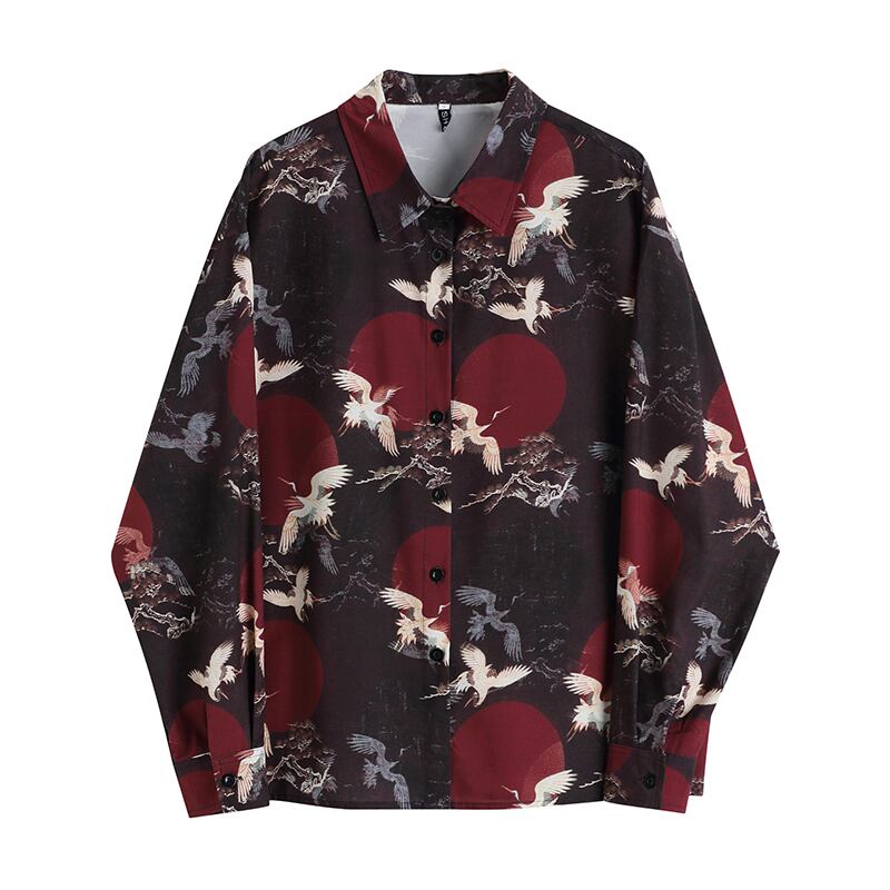 人気 ブラウス プリント 鶴柄 長袖 poloネック オリジナル 個性的 ルーズ 着痩せ
