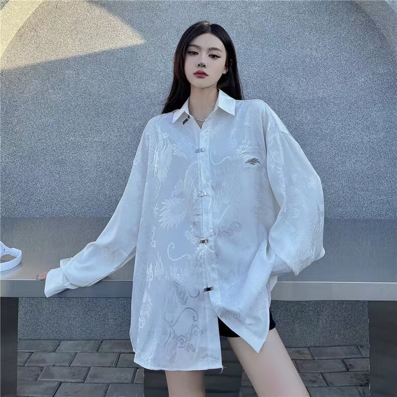 チャイナ風ブラウス チャイナ風服 金属ボタン 長袖 龍柄 個性的 オリジナルデザイン