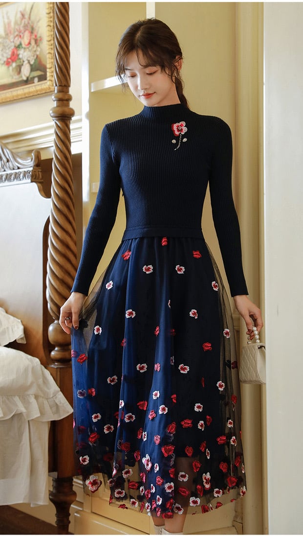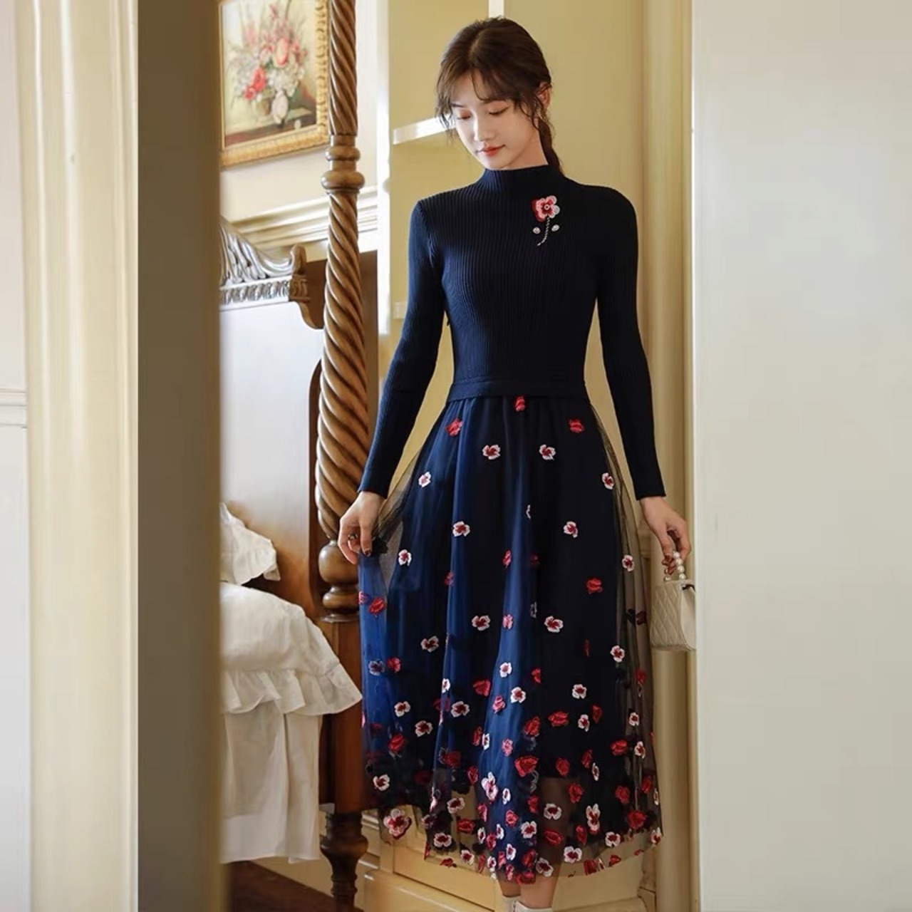 ワンピース 長袖 刺繍 スタンドネック ハイウェスト大きいサイズ おしゃれ 綺麗め