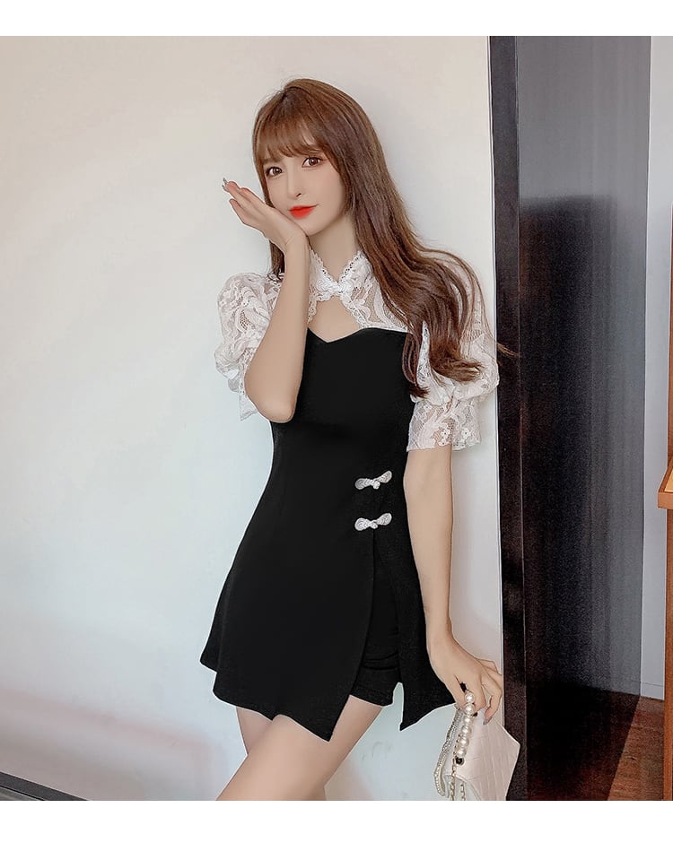 二点セット 改良型チャイナドレス レース 切り替え チャイナドレス+ホットパンツ チャイナボタン チャイナ風服 女子会 同窓会 お呼ばれ