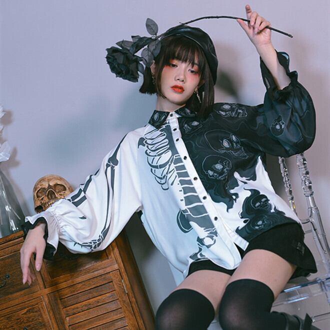 チャイナ風ブラウス 長袖 ランタンスリーブ プリント チャイナ風服 漢服 中華服