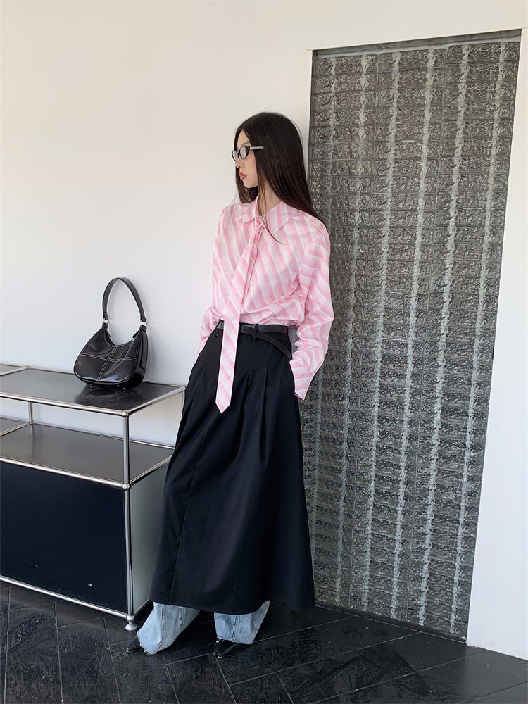 ストライブ柄 ブラウス 長袖 ネクタイ付き 着痩せ オリジナル 綺麗め