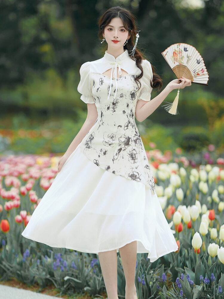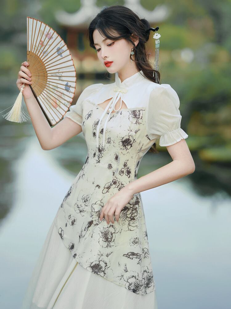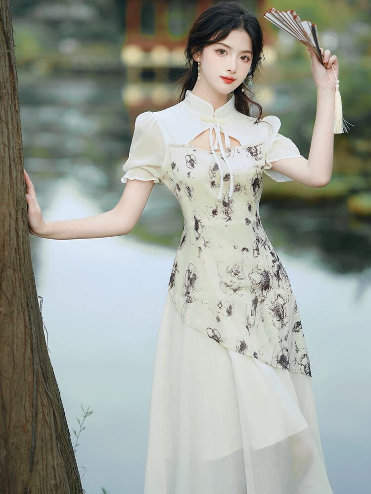 チャイナ風ワンピース 半袖チャイナボタン 着痩せ ロングワンピース 綺麗め