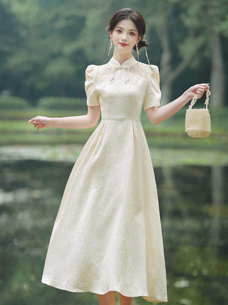 ロング チャイナ風ワンピース 半袖 チャイナボタン 着痩せ 改良型チャイナドレス 綺麗め
