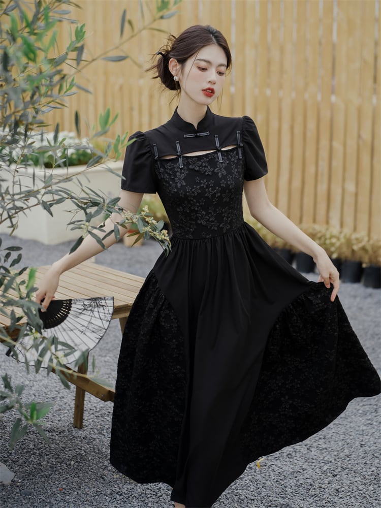 ロング チャイナ風ワンピース 半袖 チャイナボタン 着痩せ 改良型チャイナドレス 綺麗め