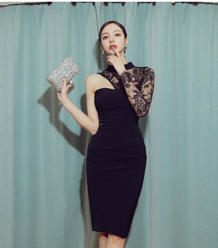 ホルターネック ワンピース レース スリット セクシー 肩出し 美しいシルエット きれいめ ブラック