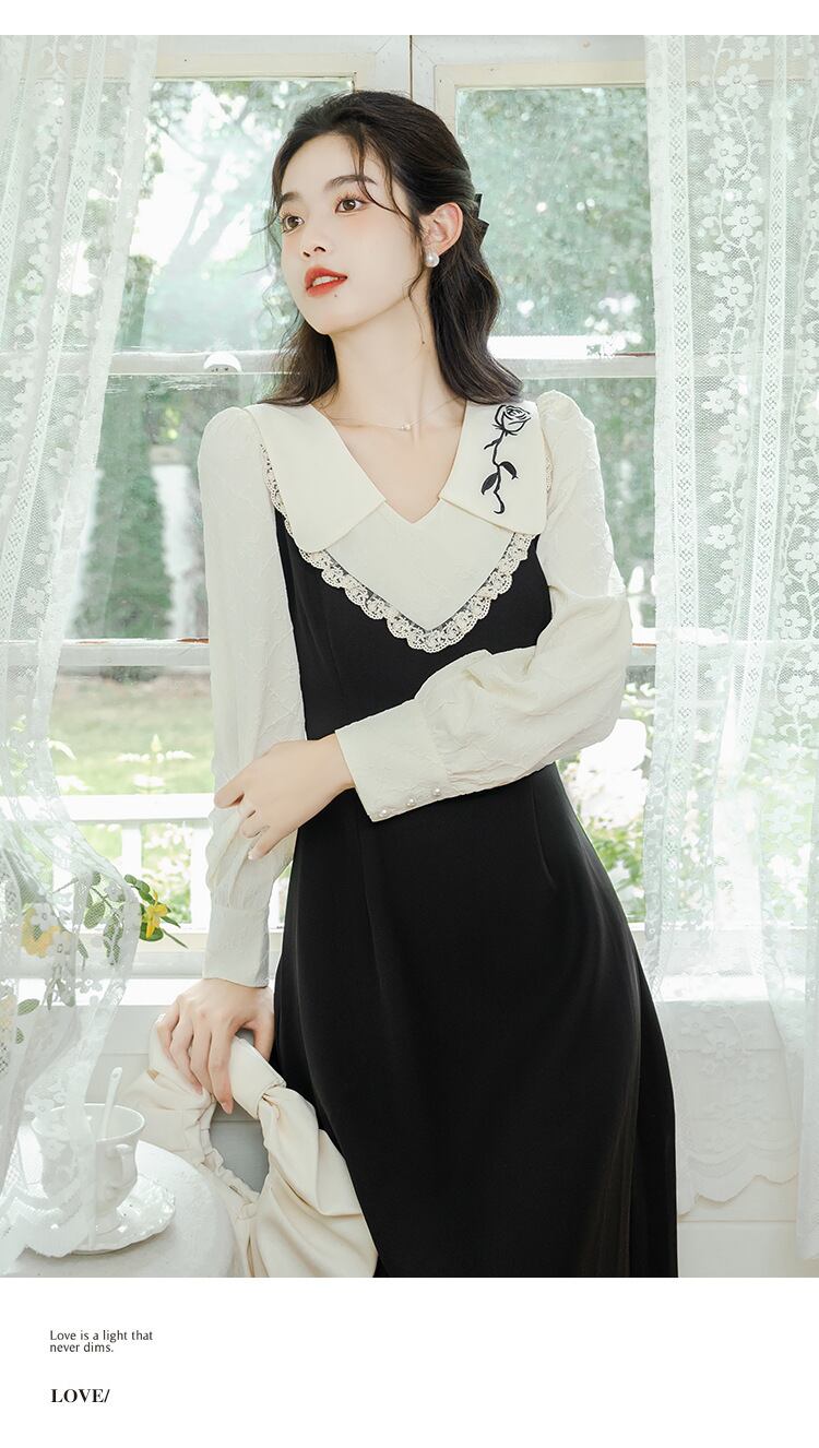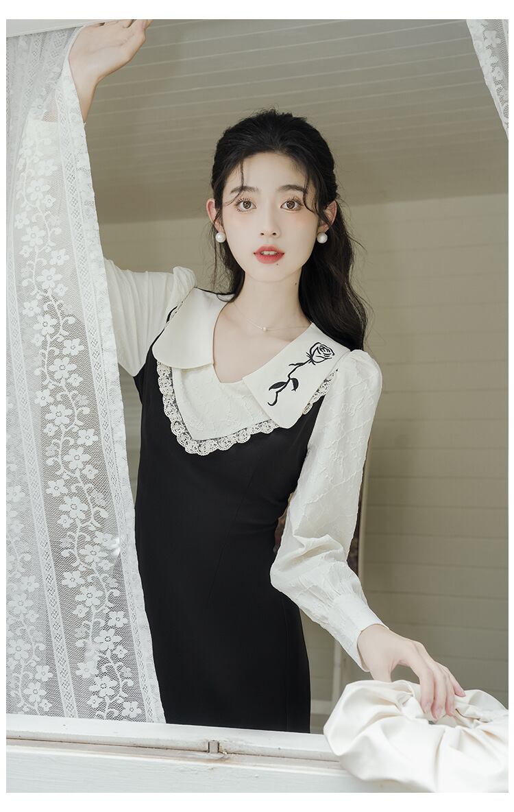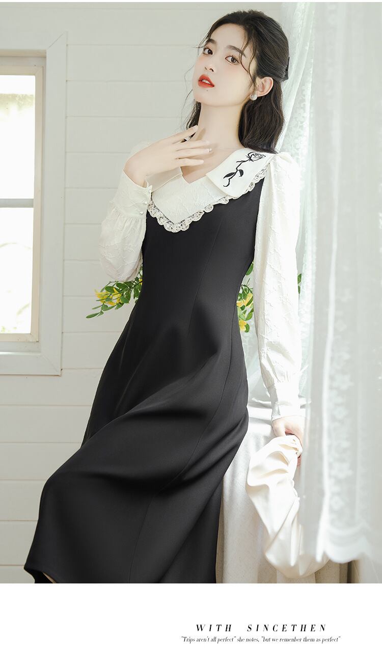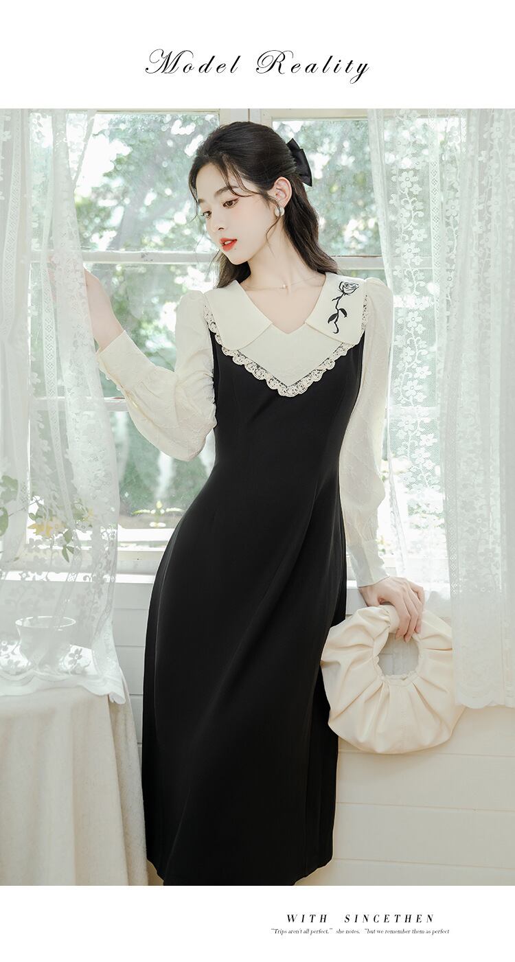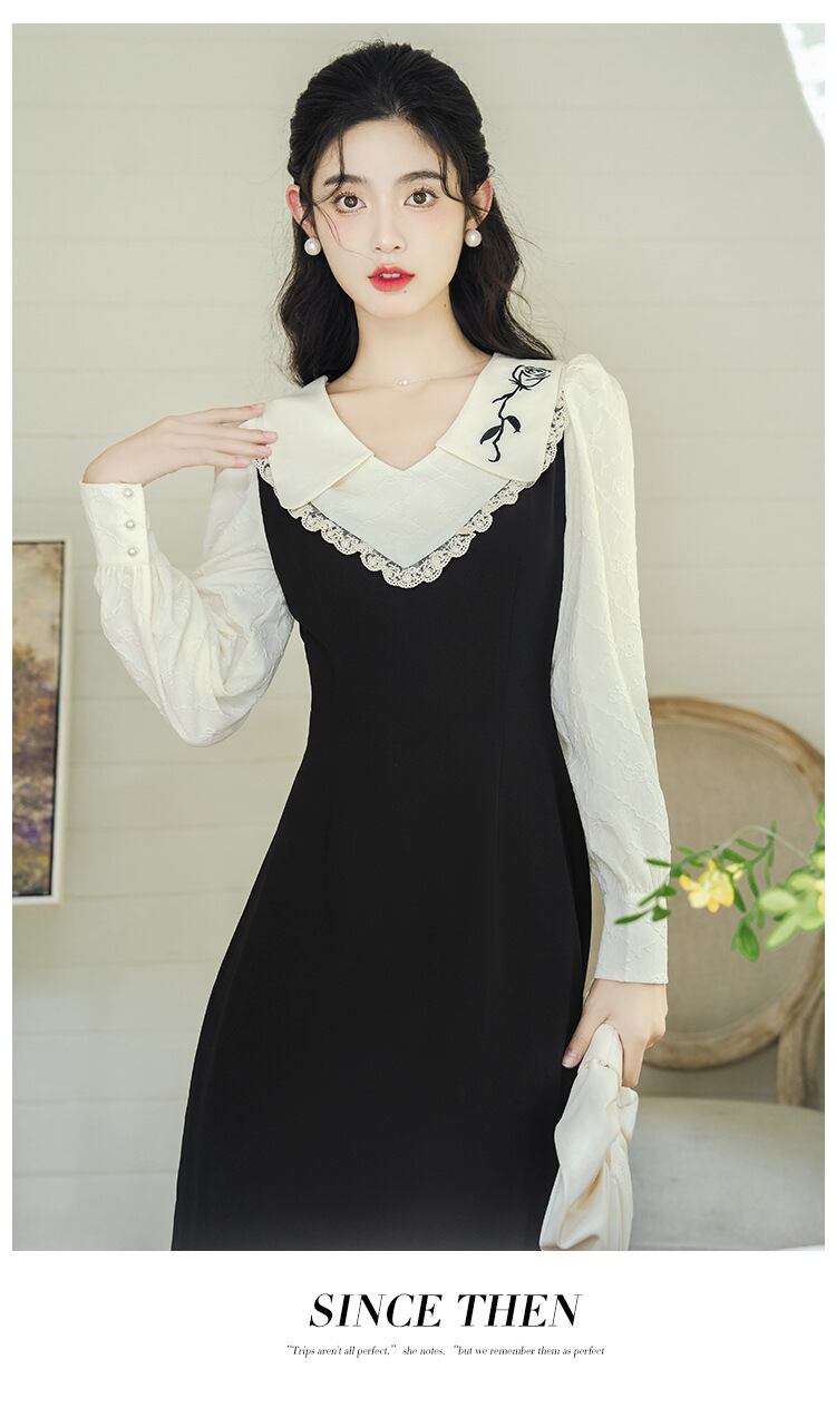 ロングワンピース 長袖 配色 刺繍 ローズ ハイウェスト きれいめ エレガント ワンピース