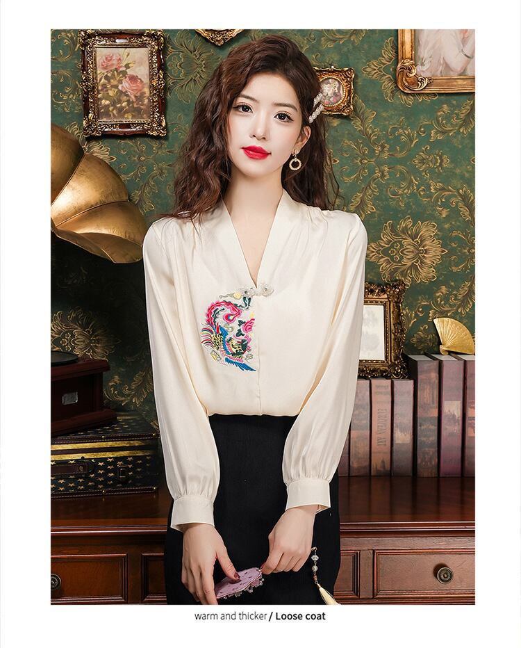 刺繍 チャイナ風ブラウス Vネック 長袖 チャイナ風服 チャイナボタン 中華服 ブラウス