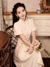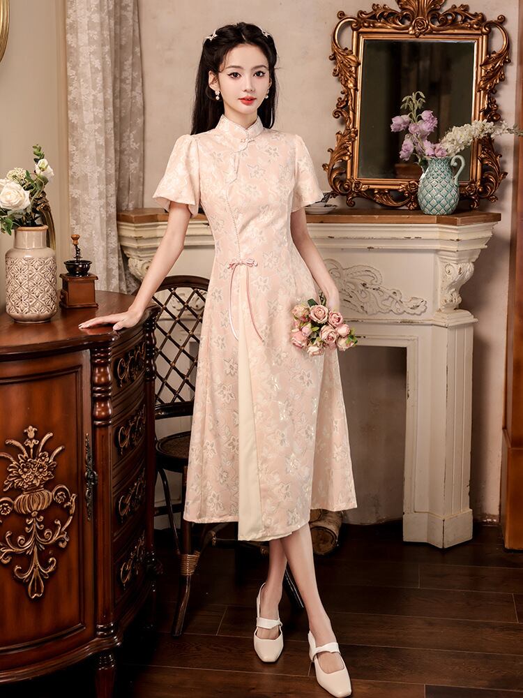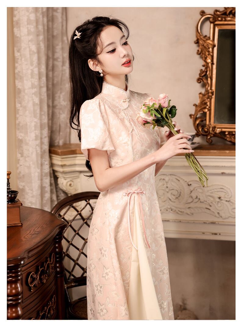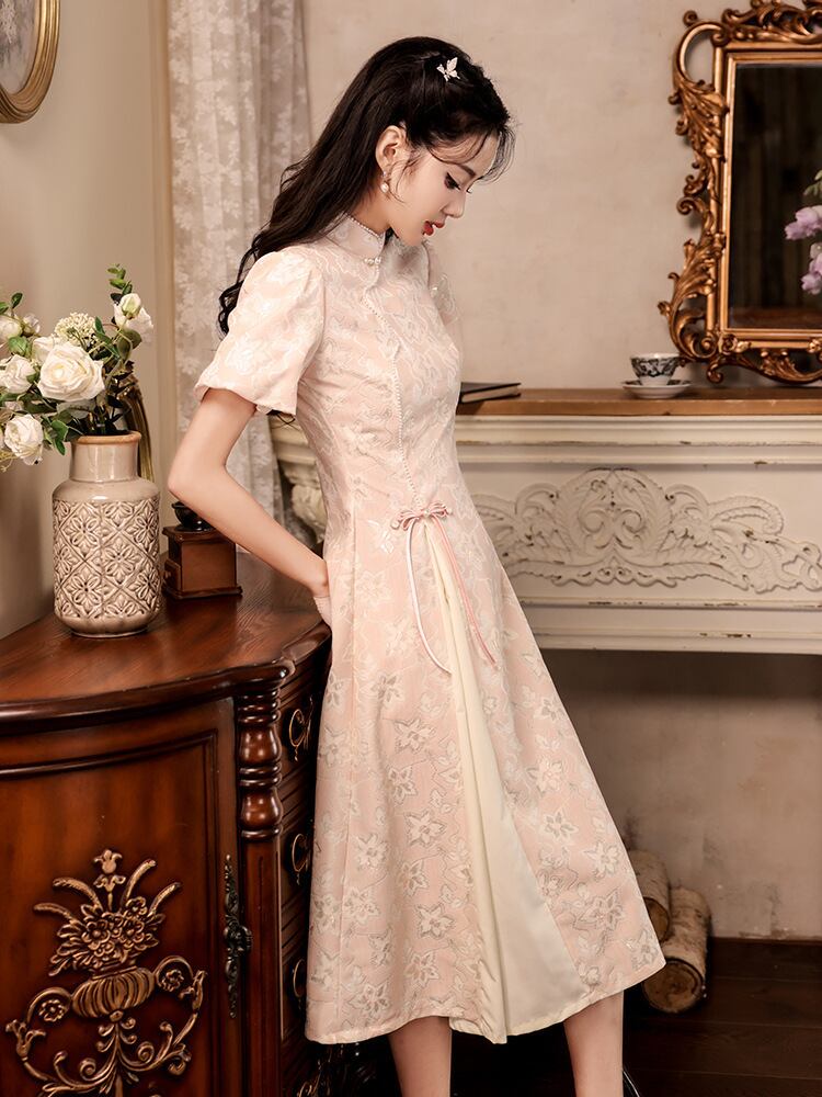レース チャイナ風ワンピース 半袖 スタンドネック サイドスリット