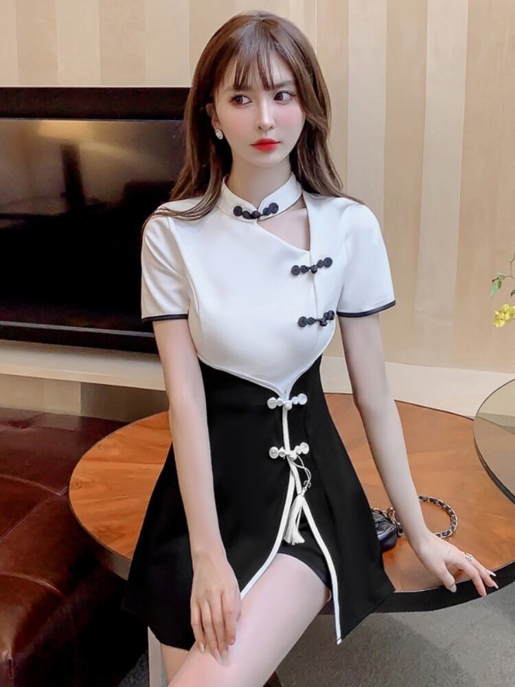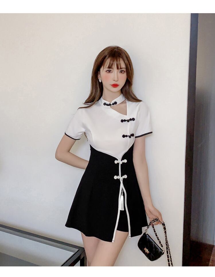 配色 チャイナ風ワンピース + ホットパンツ 二点セットアップ 改良型チャイナドレス チャイナ風服 チャイナボタン