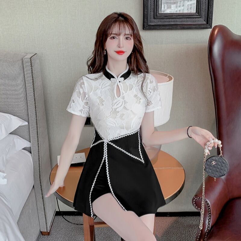 チャイナ風ワンピース + ホットパンツ 二点セットアップ 改良型チャイナドレス チャイナ風服 チャイナボタン