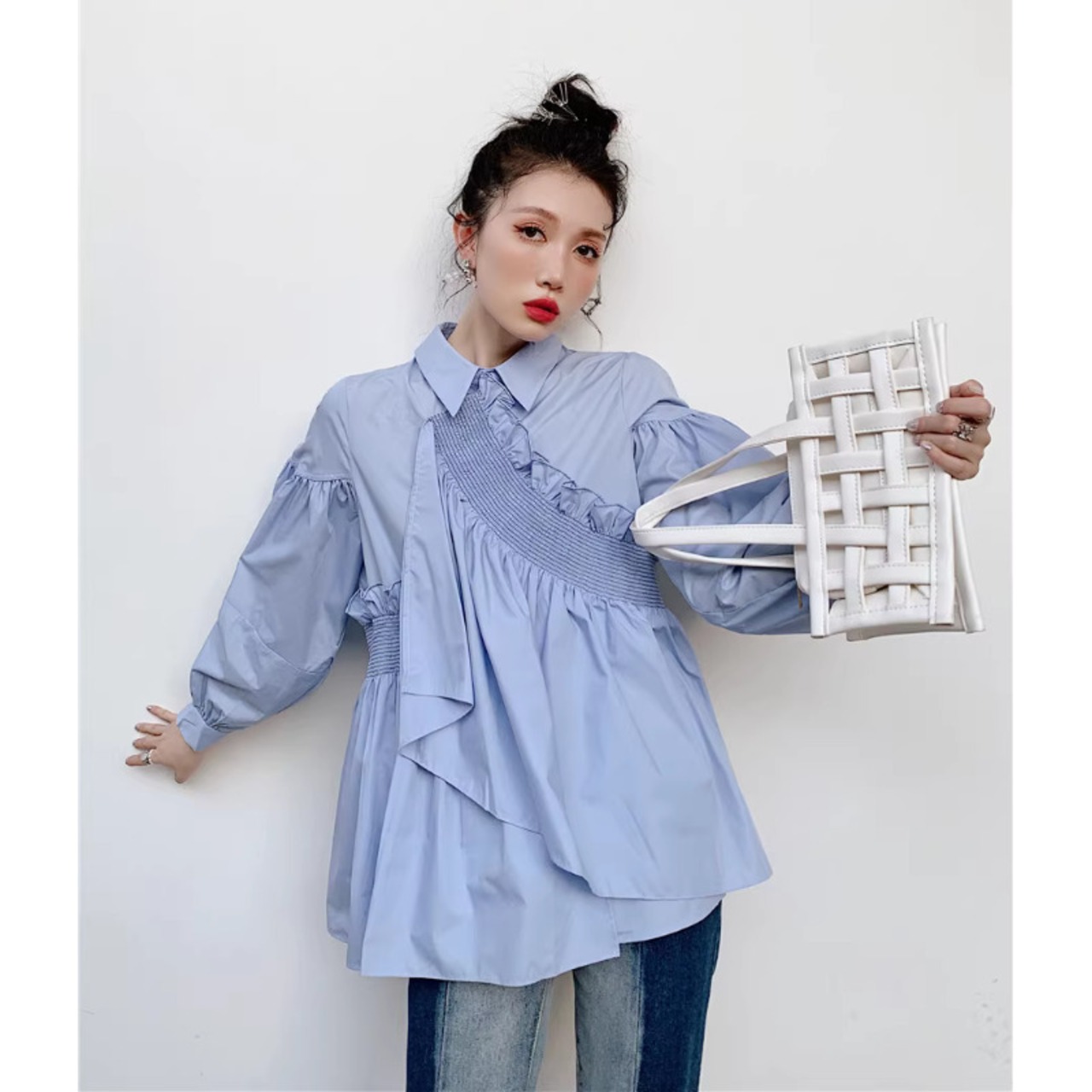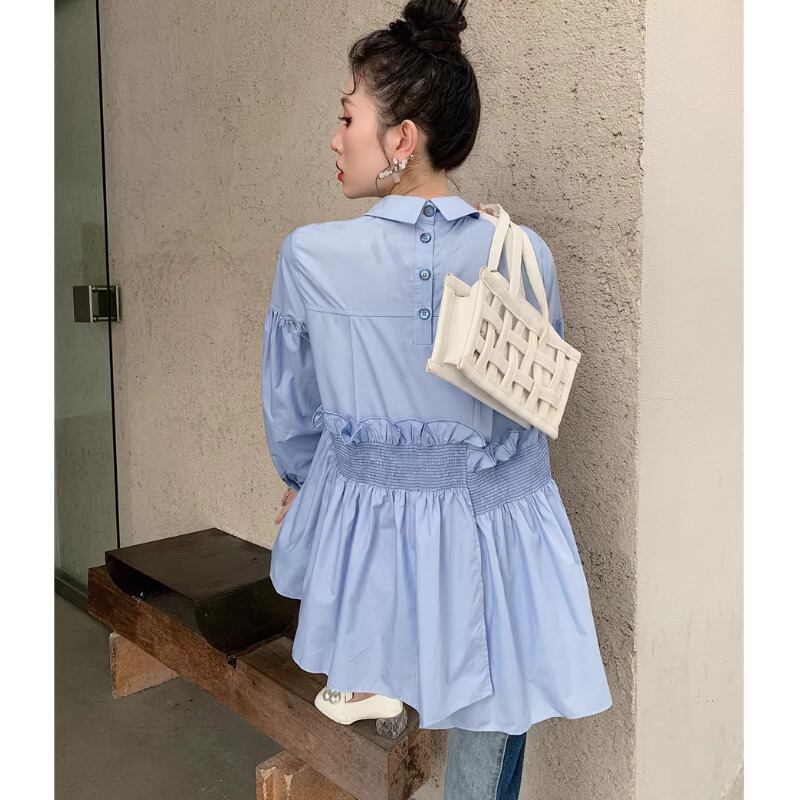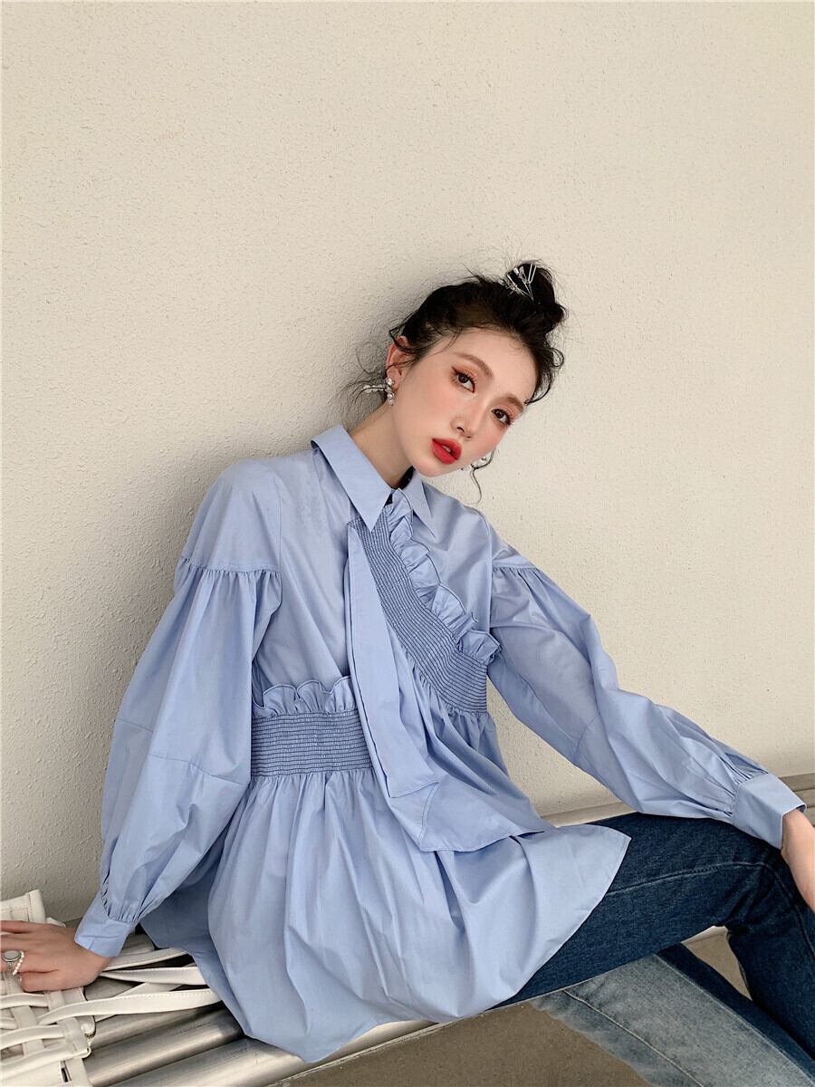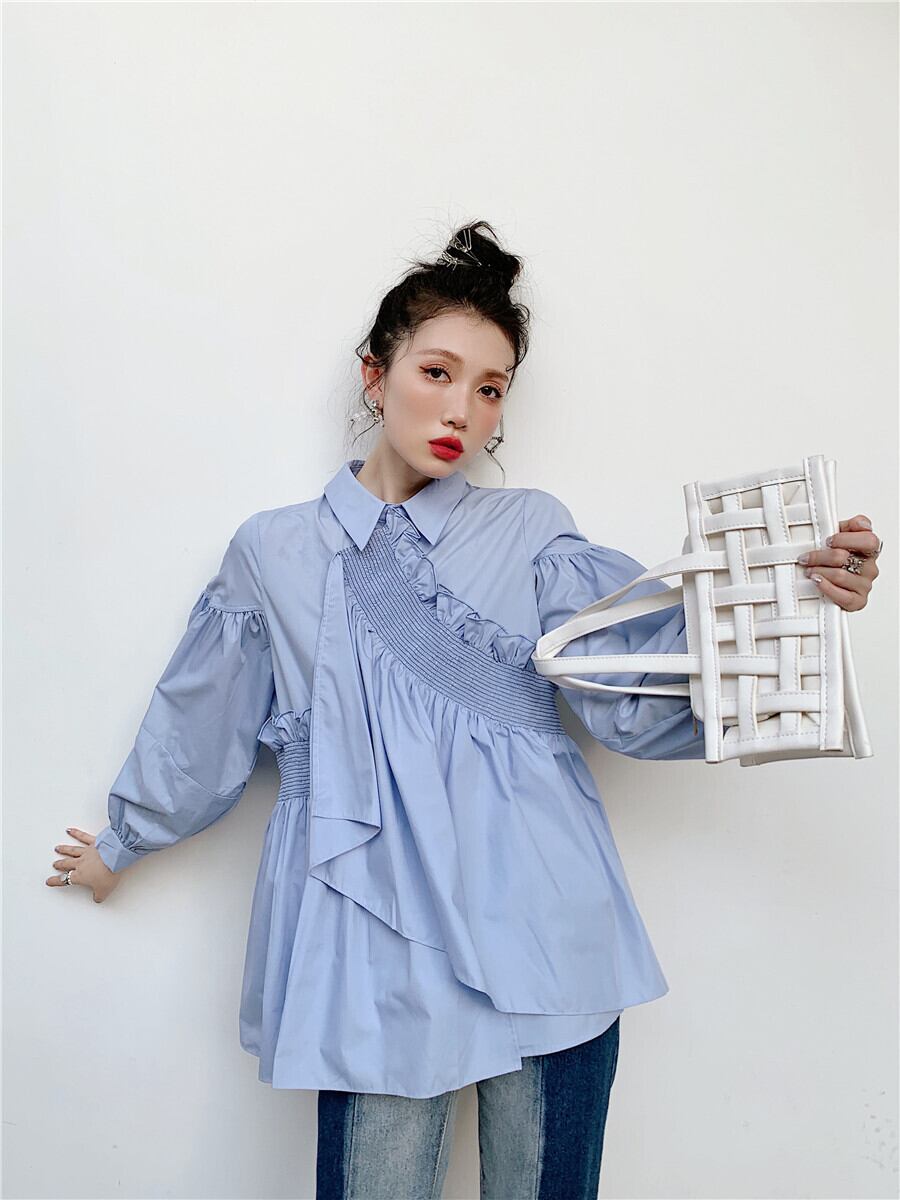 不規則 ブルー ブラウス 長袖 きれいめ オリジナルデザイン