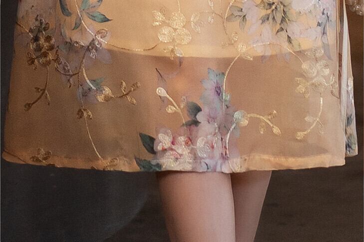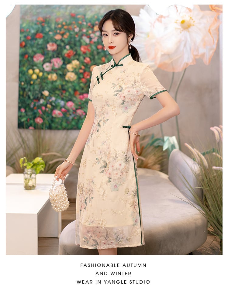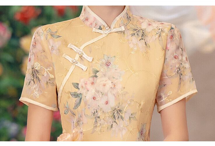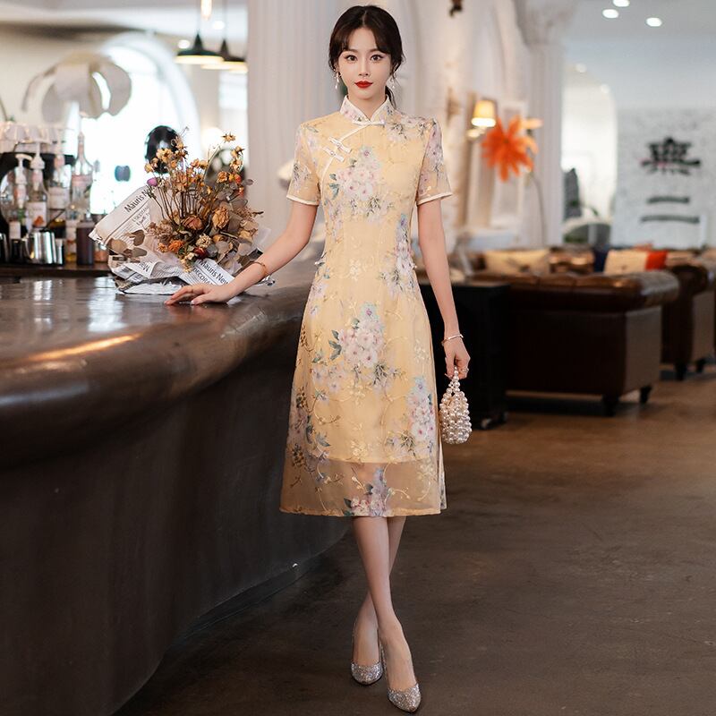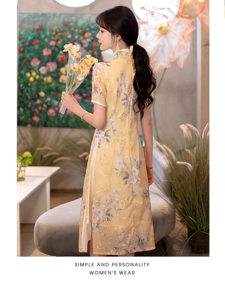 チャイナ風ワンピース 2色 半袖 着痩せ ハイウェスト 改良型チャイナドレス チャイナ風服 綺麗め