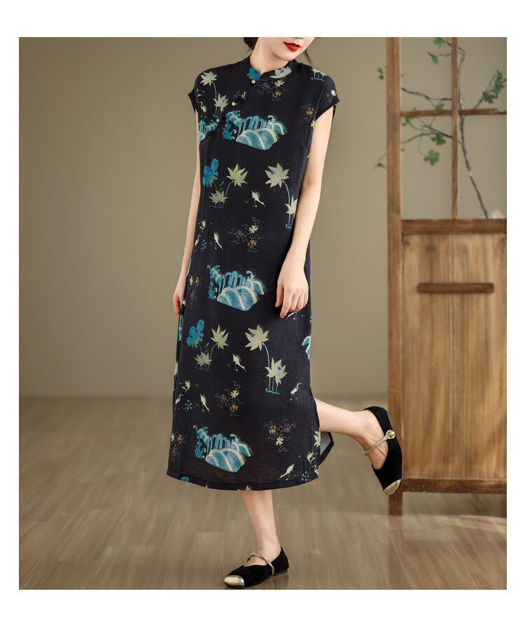 チャイナ風ワンピース プリント チャイナ風服 チャイナボタン 綺麗め Aライン
