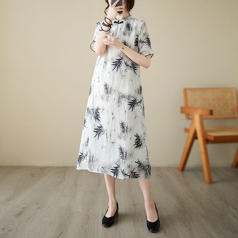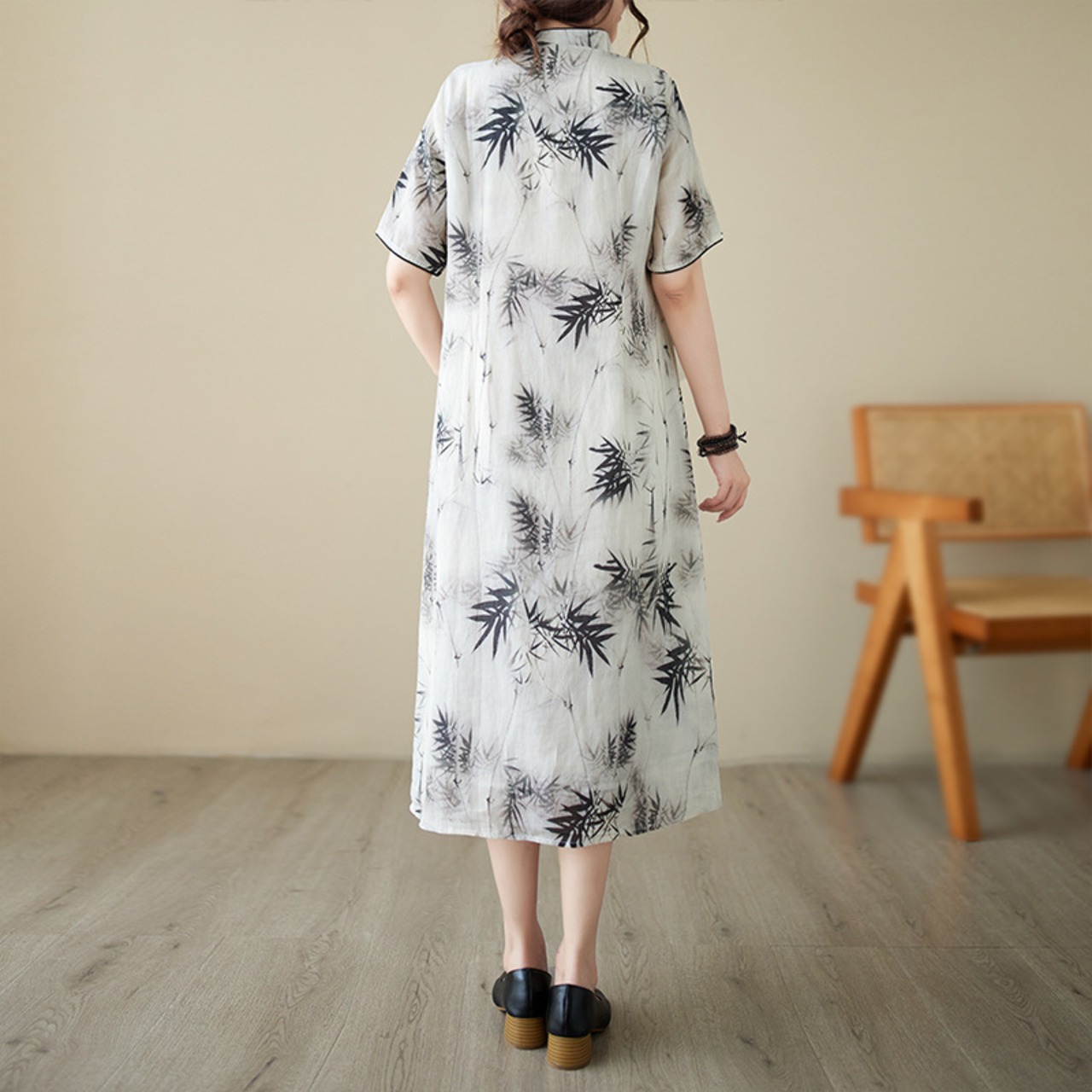 チャイナ風ワンピース 竹柄 プリント チャイナ風服 チャイナボタン 綺麗め Aライン