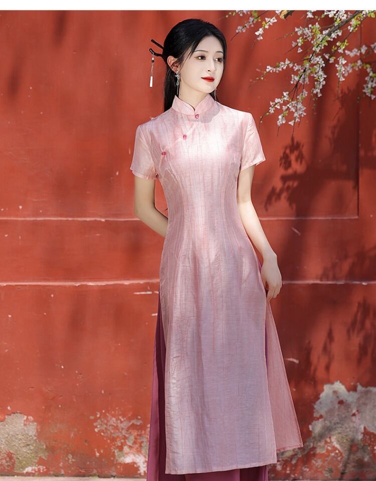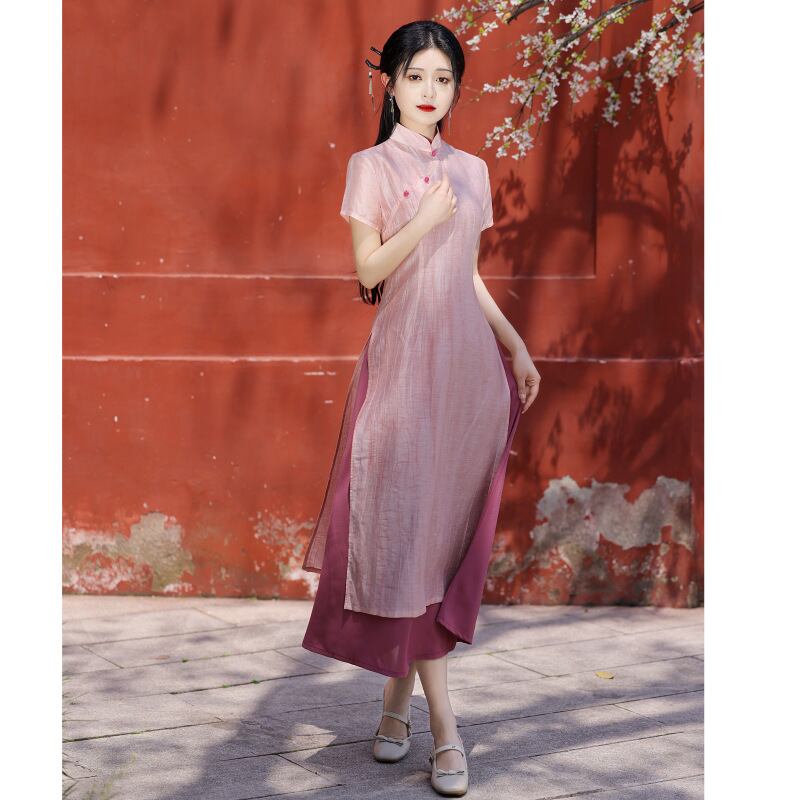 ピンク アオザイ ハイウェスト 半袖 洋服 エレガント 改良型チャイナドレス 大きいサイズ