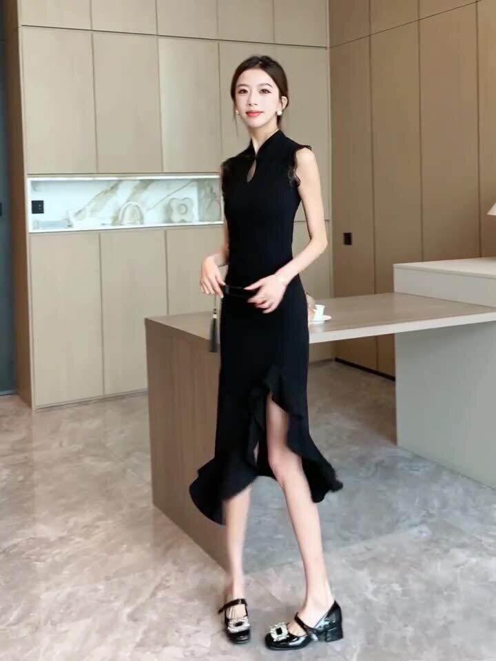 フィッシュテール 改良型チャイナドレス チャイナ風ワンピース ハイウェスト チャイナボタン サイドスリット 洋服 可愛い チャイナ服