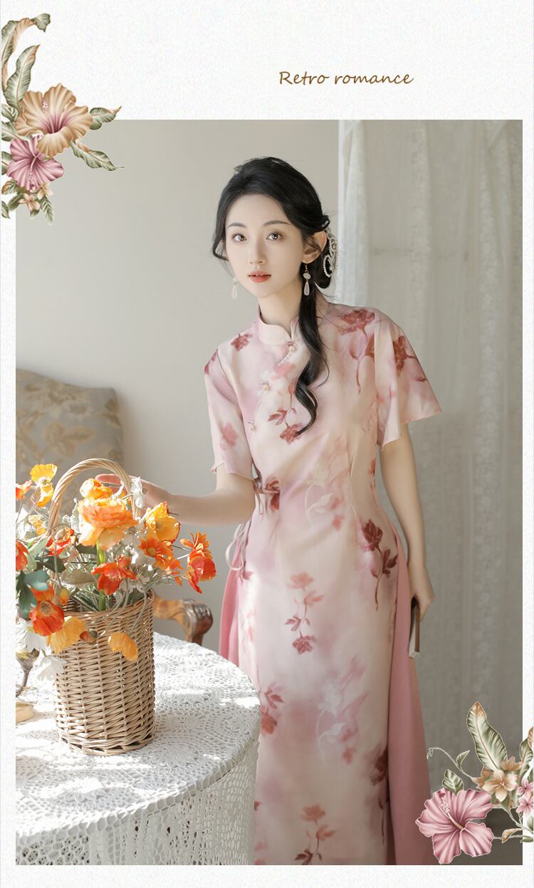 チャイナ風ワンピース Aライン ハイウェスト 半袖 綺麗め ロングワンピース
