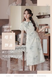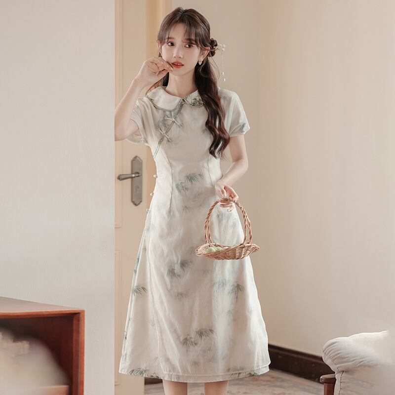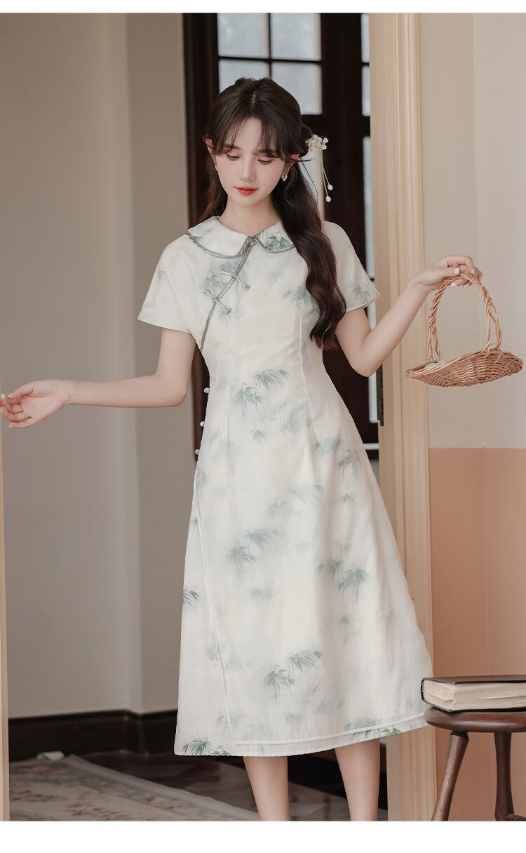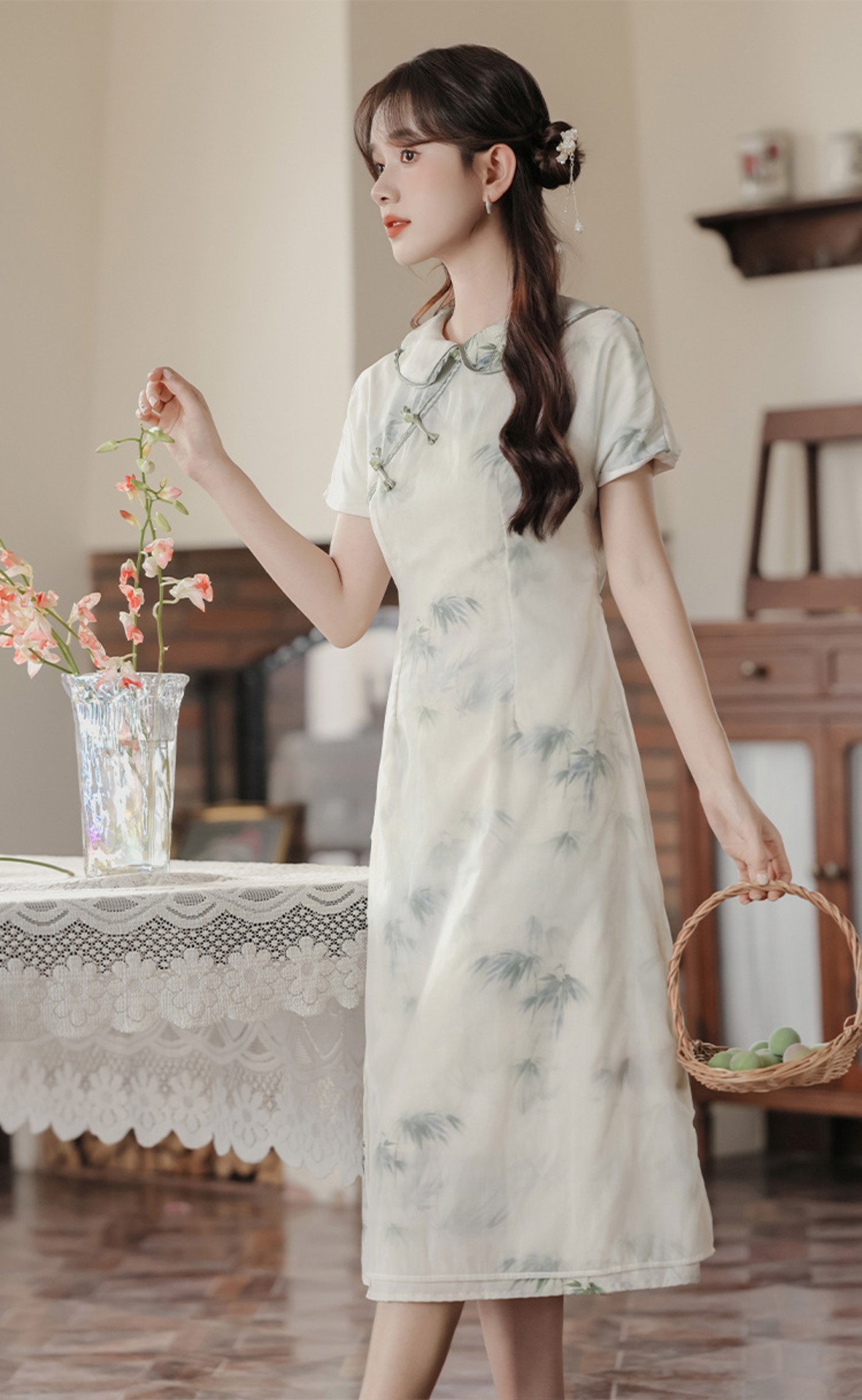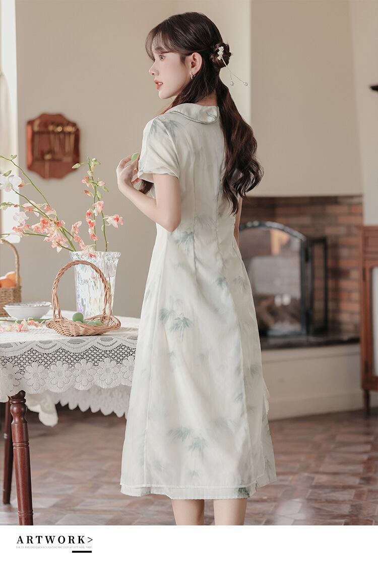 チャイナ風ワンピース 折り襟 チャイナボタン 半袖 チャイナ風服 着心地抜群 グリーン