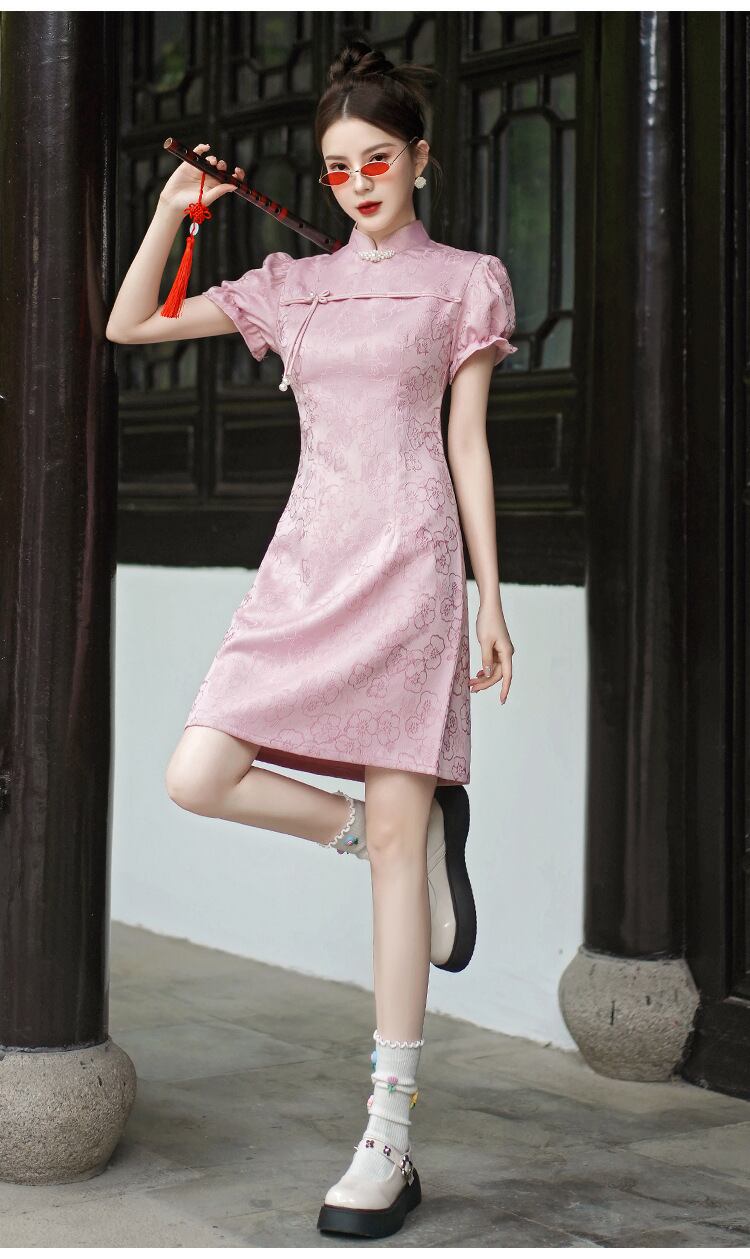 チャイナ風ワンピース 折り襟 チャイナボタン 半袖 チャイナ風服 着心地抜群 ピンク 大きいサイズ