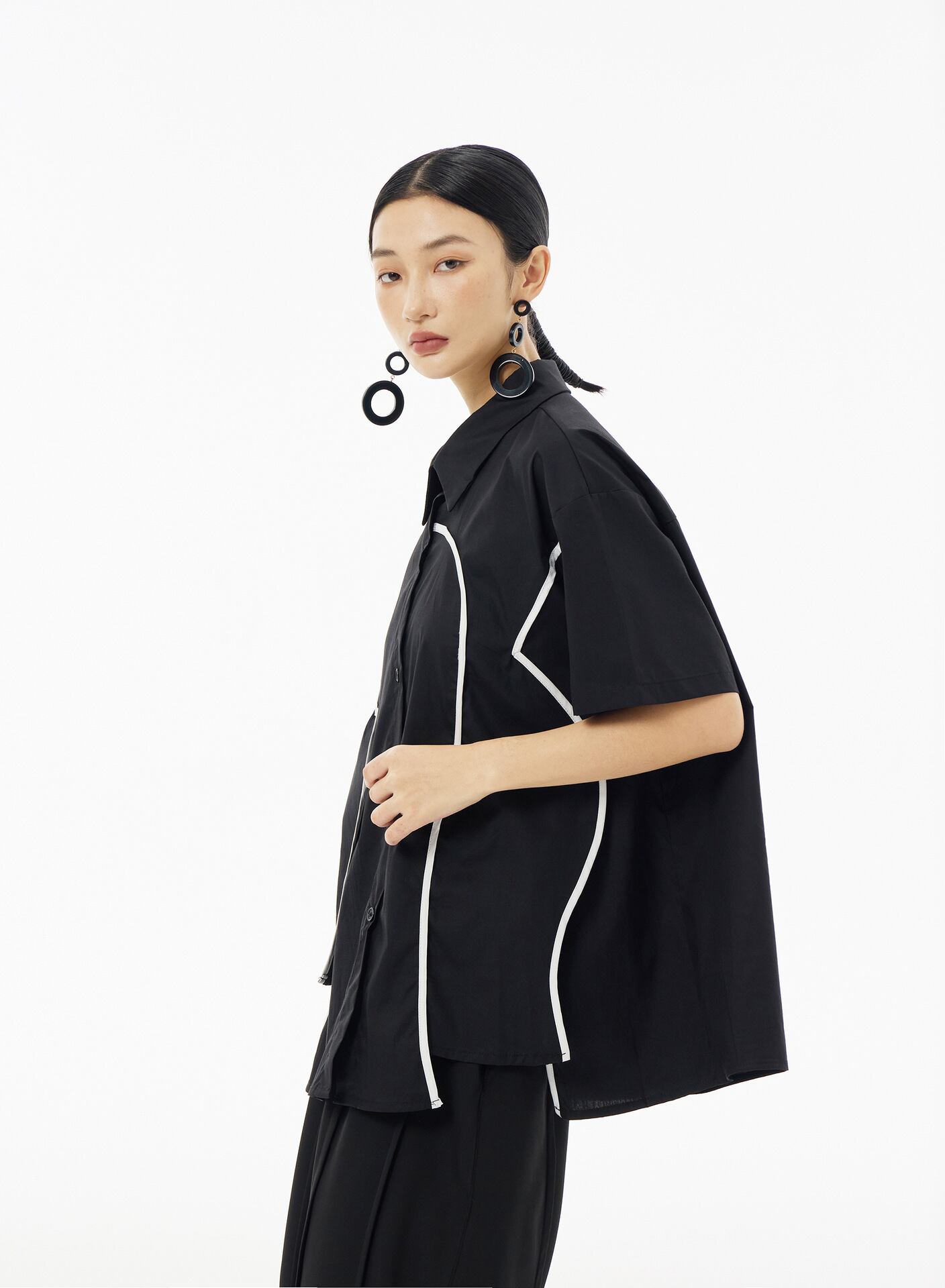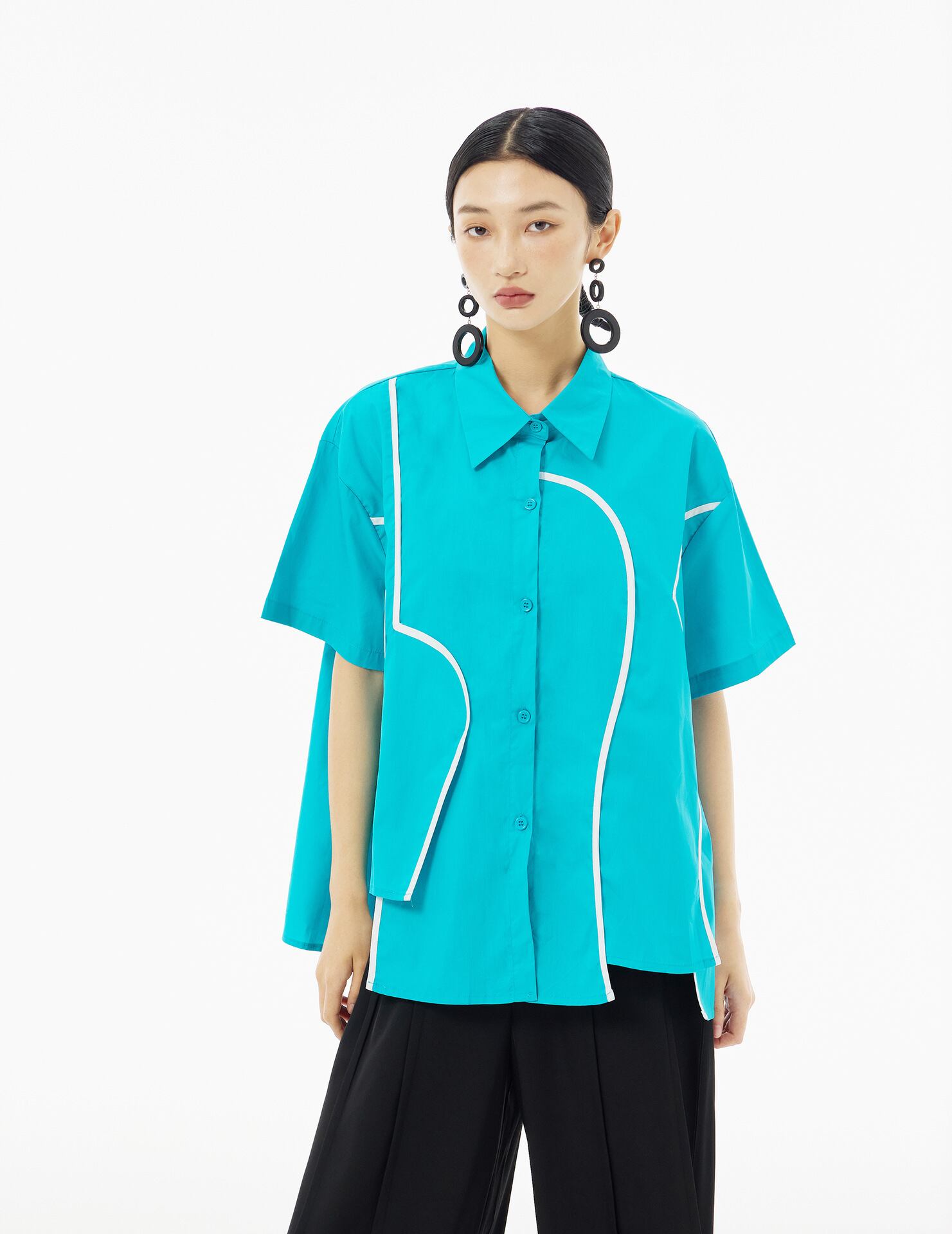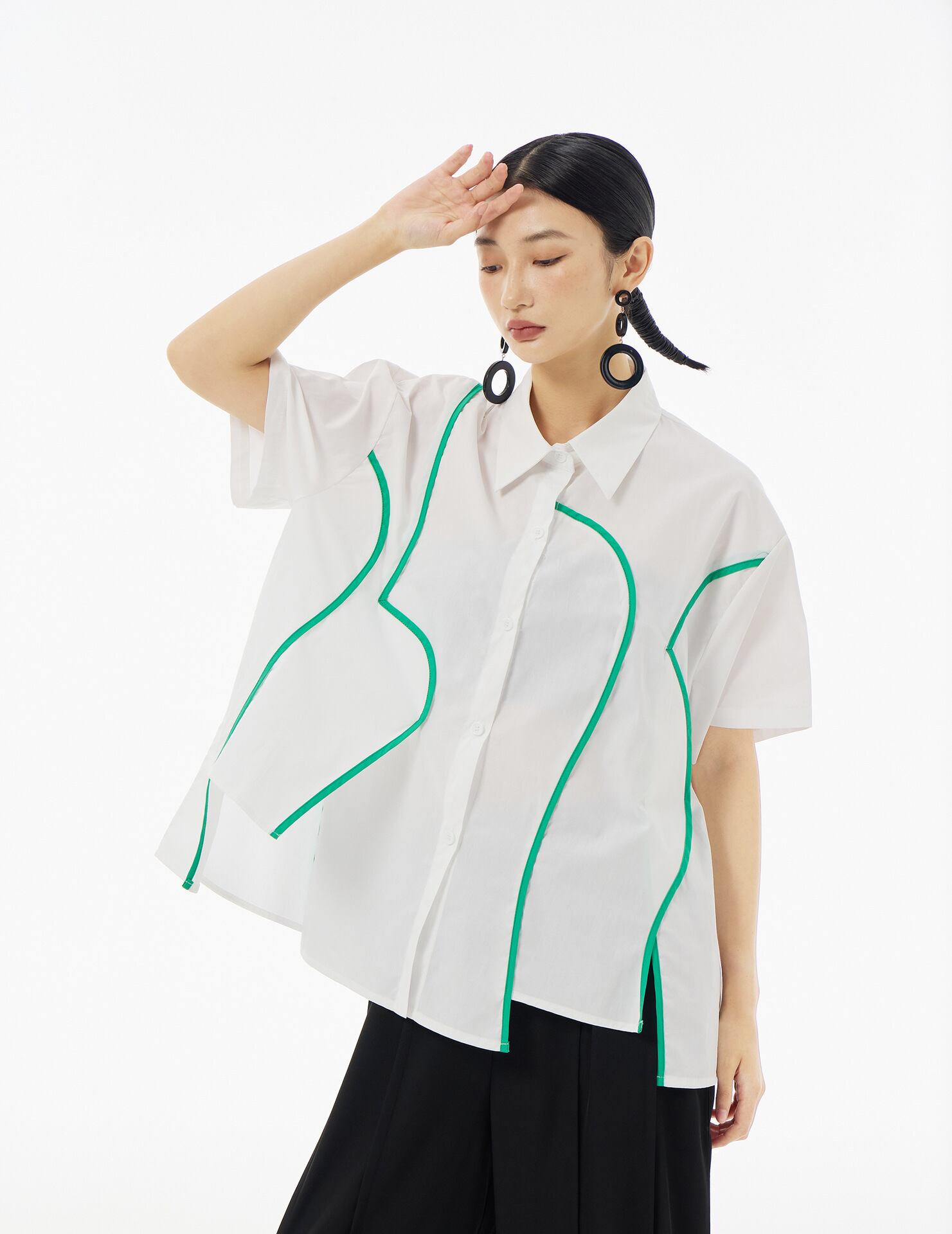 切り替え ブラウス 4色 配色 半袖 POLOネック 綺麗め 着痩せ