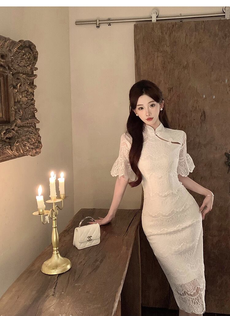 レース チャイナ風ワンピース ハイウェスト 綺麗め 着痩せ Aライン ワンピース