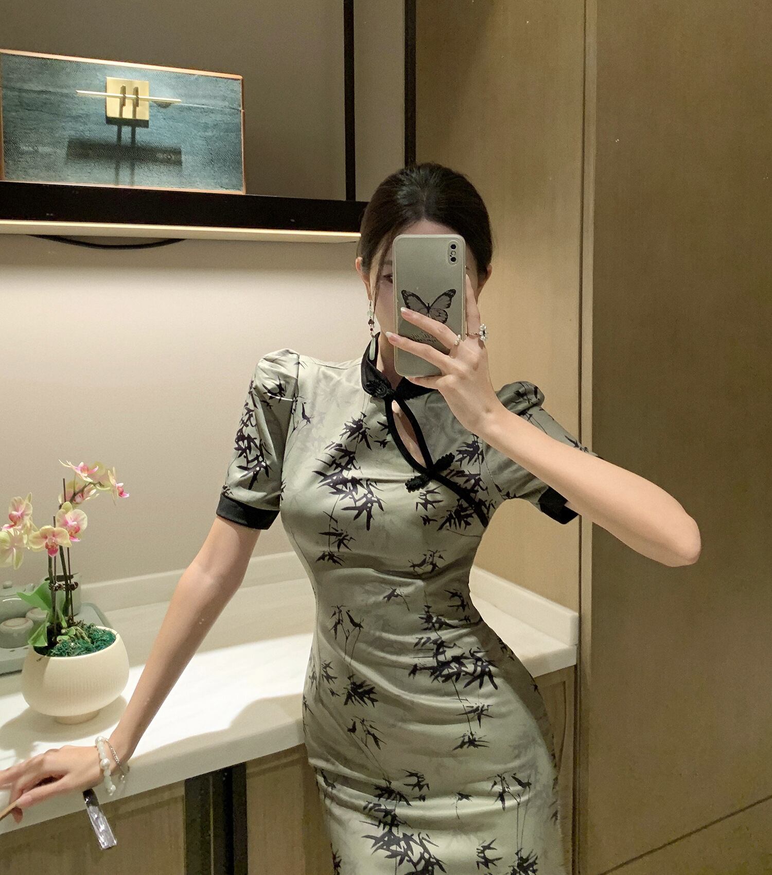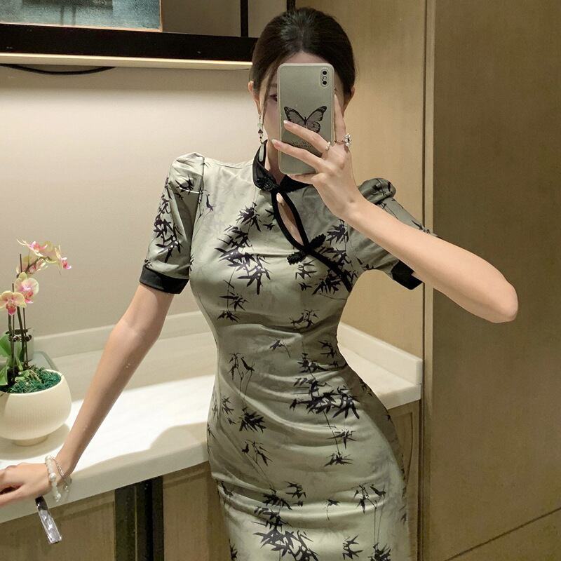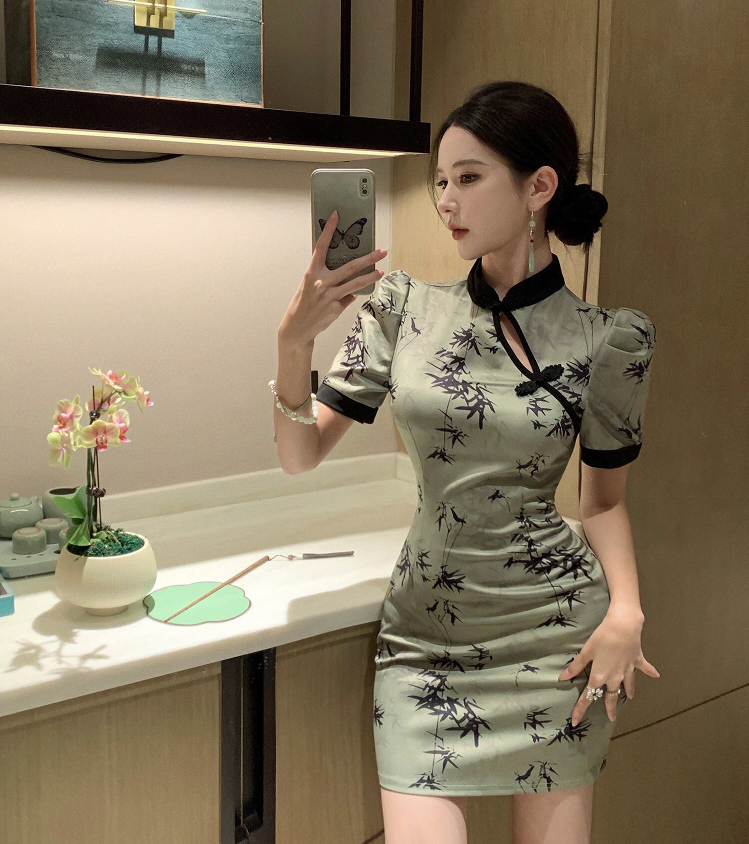 チャイナ風ワンピース ハイウェスト 綺麗め 着痩せ タイトライン ワンピース 洋服