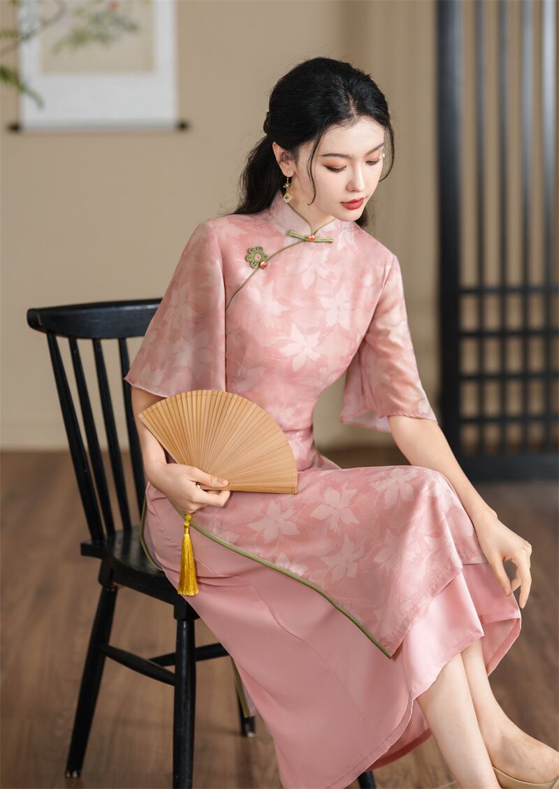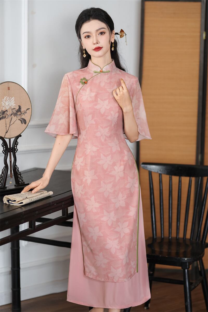 アオザイ ピンク 改良型チャイナドレス スタンドネック 洋服 綺麗め 大きいサイズ