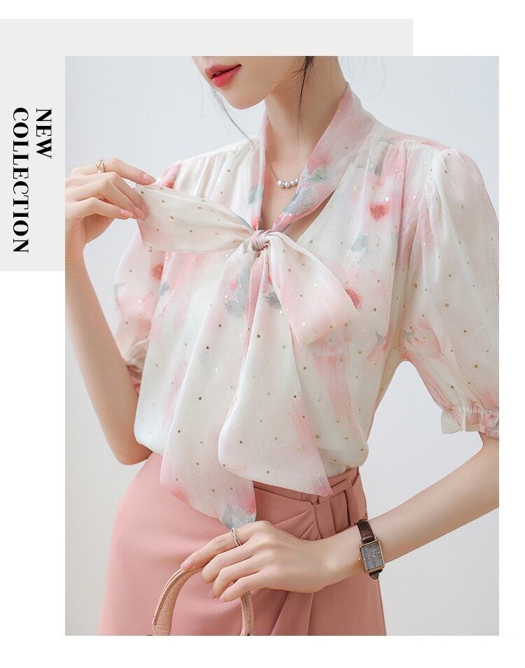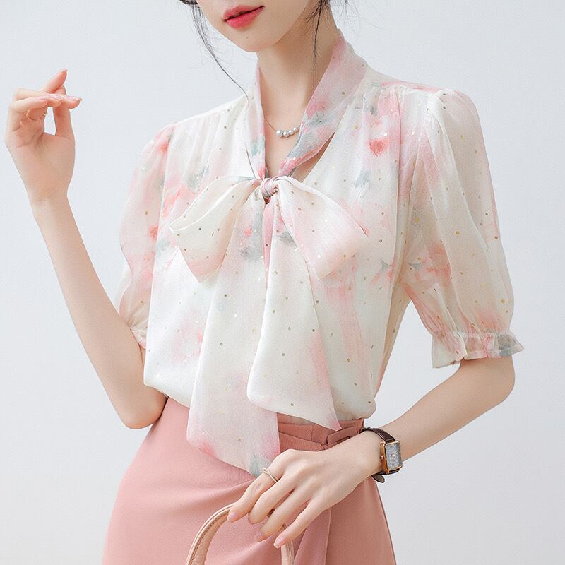 かわいい シャツ スタンドネック 半袖 リボンネック 着痩せ