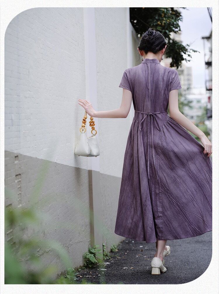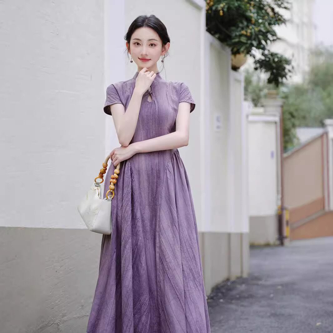 チャイナ服ワンピース 半袖 ハイウェスト 綺麗め 着痩せ ロングワンピース