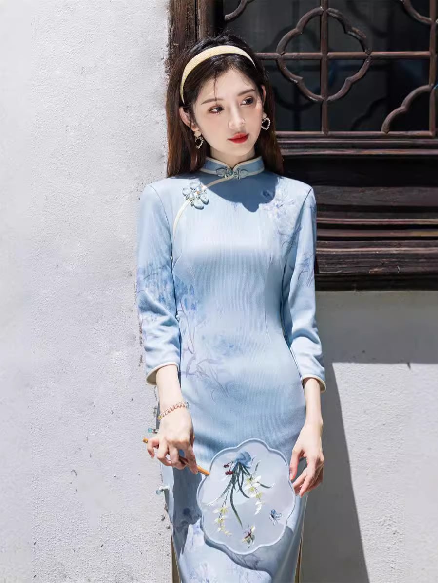 2色 チャイナドレス 七分袖 プリント チャイナ服 チャイナボタン 可愛い 大きいサイズ