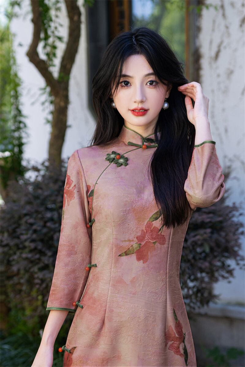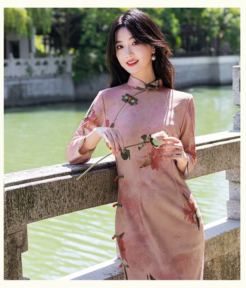 ピンク チャイナドレス 七分袖 チャイナ服 チャイナボタン 大きいサイズ