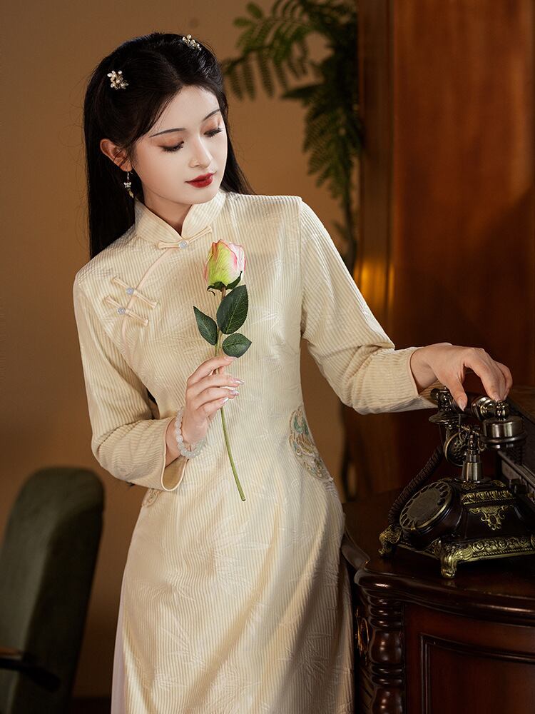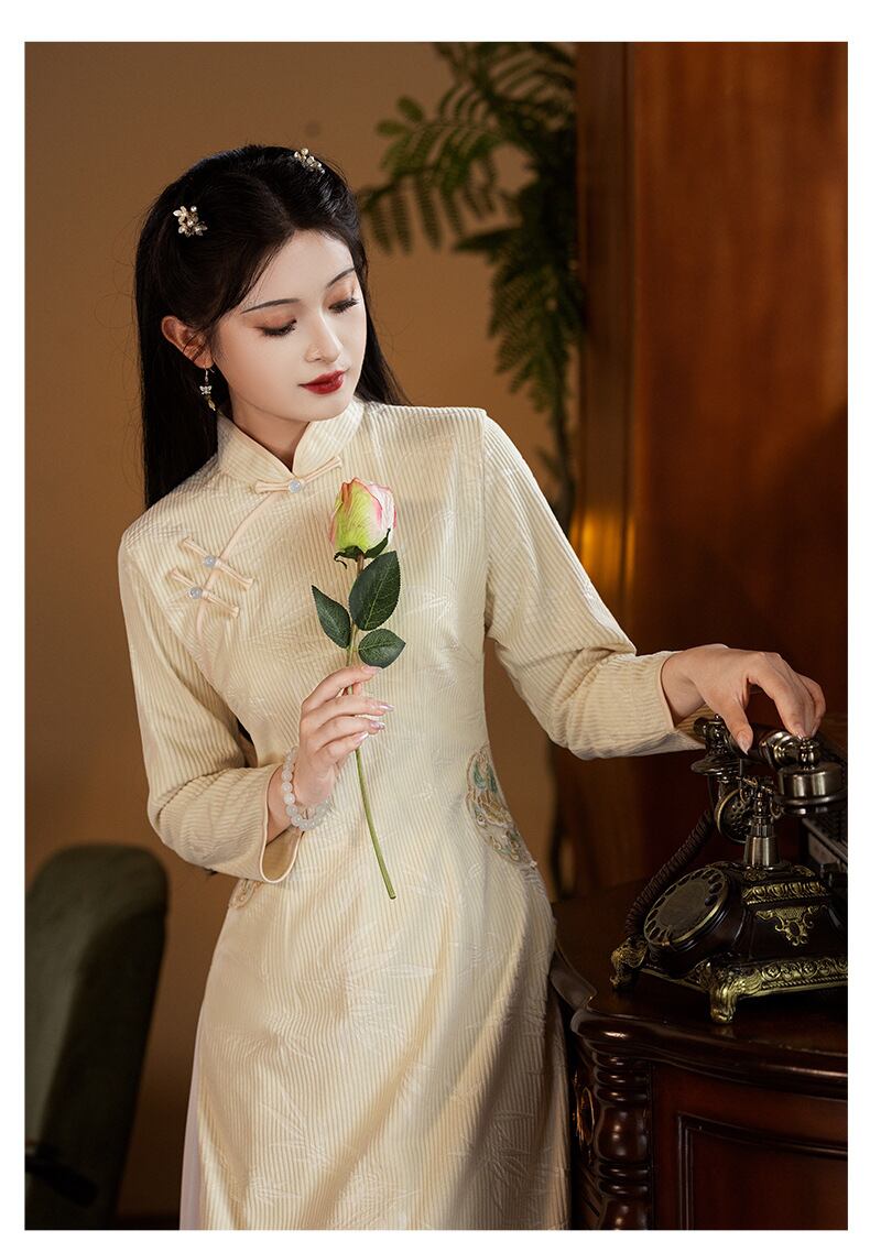ベージュ アオザイ 長袖 チャイナ服 チャイナボタン 綺麗め 洋服 エレガント