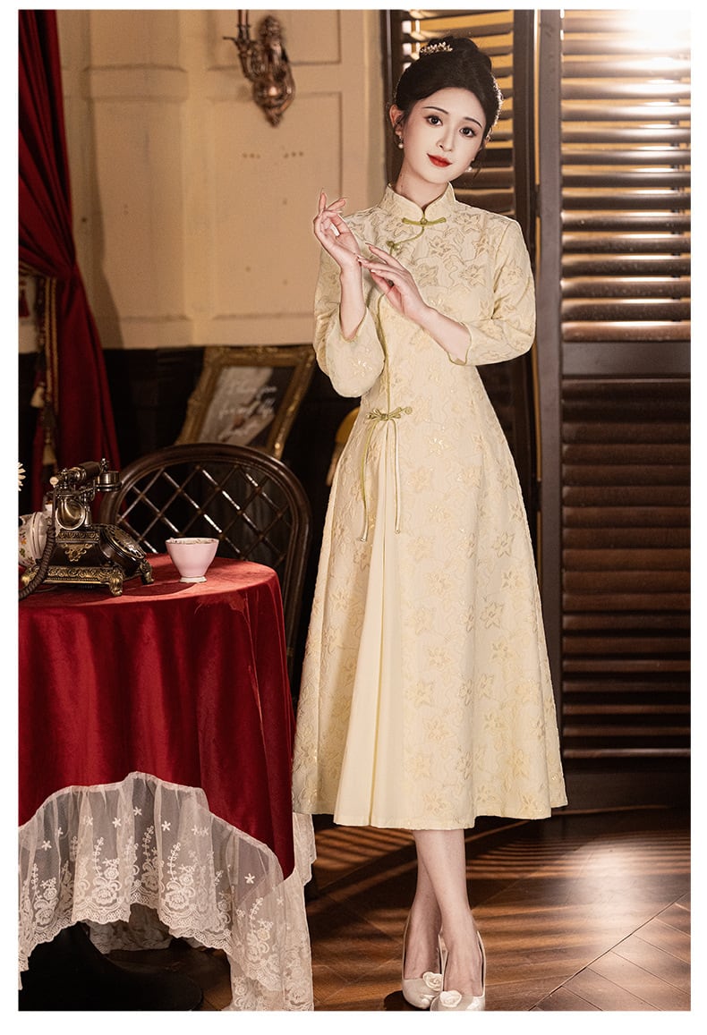 ベージュ レース アオザイ 七分袖 チャイナ服 チャイナボタン 綺麗め 洋服 エレガント